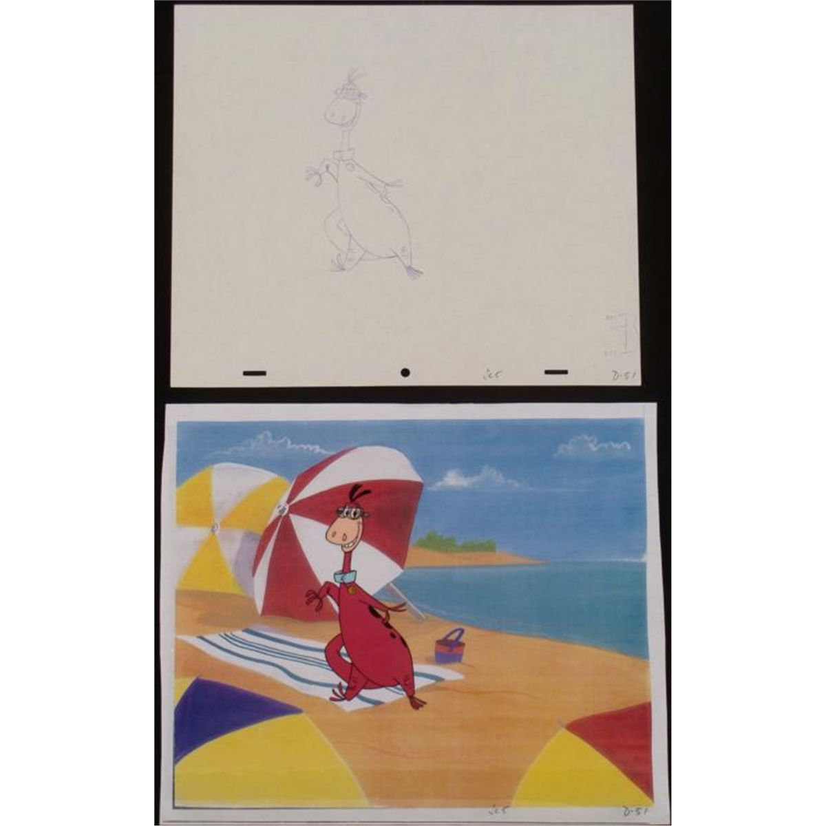 It appears Dino is in the ready stance. The cel comes with a matching drawing overlay. * * Original Production Art Cel, Drawing, and Reproduction Background Original "rough" animation drawing, with notations in black and purple. Dino has been outlined in purple Overall Size of the Cel: 10 1/2" x 12 1/2" Overall Size of Reproduction Background: 11" x 13 1/4" * Excellent condition This is an original hand-painted cel set-up used in the production of an episode of "The Flintstones." Each one-of-a-kind set-up represents a slight change in position of the characters. When individually photographed and projected in rapid succession, the images appear to move. * To create production cels, the original animator's drawing is transferred onto an acetate cel (by hand-inking and/or photo copying). The cel is then hand-painted on the reverse side. The background accompanying this set-up is a reproduction background. * * The cel, drawing, and background are ready to be matted and framed. The animator's notations are shown at the bottom of the cel and drawing. *