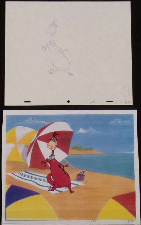 It appears Dino is in the ready stance. The cel comes with a matching drawing overlay. * * Original Production Art Cel, Drawing, and Reproduction Background Original "rough" animation drawing, with notations in black and purple. Dino has been outlined in purple Overall Size of the Cel: 10 1/2" x 12 1/2" Overall Size of Reproduction Background: 11" x 13 1/4" * Excellent condition This is an original hand-painted cel set-up used in the production of an episode of "The Flintstones." Each one-of-a-kind set-up represents a slight change in position of the characters. When individually photographed and projected in rapid succession, the images appear to move. * To create production cels, the original animator's drawing is transferred onto an acetate cel (by hand-inking and/or photo copying). The cel is then hand-painted on the reverse side. The background accompanying this set-up is a reproduction background. * * The cel, drawing, and background are ready to be matted and framed. The animator's notations are shown at the bottom of the cel and drawing. *