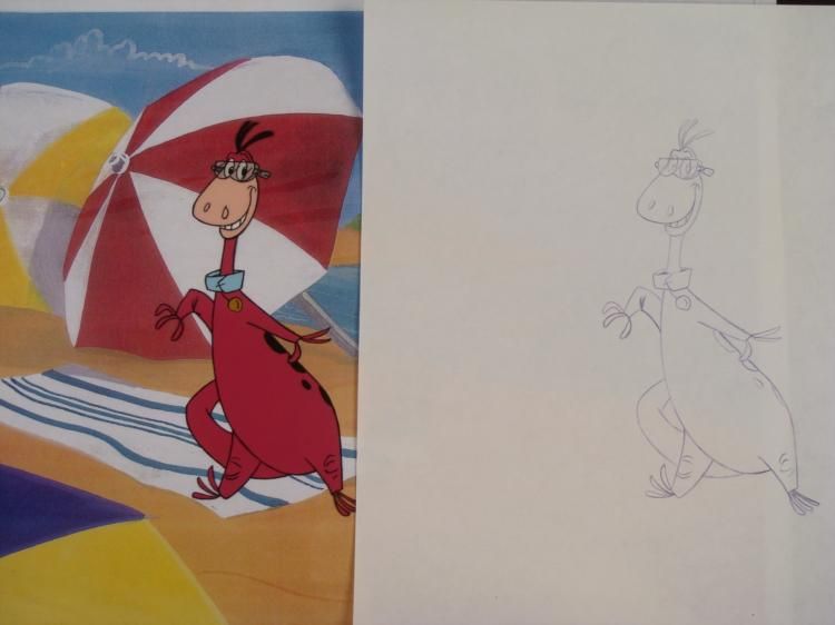It appears Dino is in the ready stance. The cel comes with a matching drawing overlay. * * Original Production Art Cel, Drawing, and Reproduction Background Original "rough" animation drawing, with notations in black and purple. Dino has been outlined in purple Overall Size of the Cel: 10 1/2" x 12 1/2" Overall Size of Reproduction Background: 11" x 13 1/4" * Excellent condition This is an original hand-painted cel set-up used in the production of an episode of "The Flintstones." Each one-of-a-kind set-up represents a slight change in position of the characters. When individually photographed and projected in rapid succession, the images appear to move. * To create production cels, the original animator's drawing is transferred onto an acetate cel (by hand-inking and/or photo copying). The cel is then hand-painted on the reverse side. The background accompanying this set-up is a reproduction background. * * The cel, drawing, and background are ready to be matted and framed. The animator's notations are shown at the bottom of the cel and drawing. *