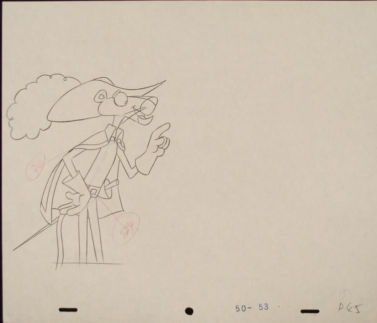 Here, it appears that the Pink Panther is talking to someone. This is an original drawing from the production of the Pink Panther cartoon show * Drawing size: 10 1/2 x 12 1/2 inchesDetails: Number at the bottom edgeColor: Red, black, and blue pencil * Condition: Very good