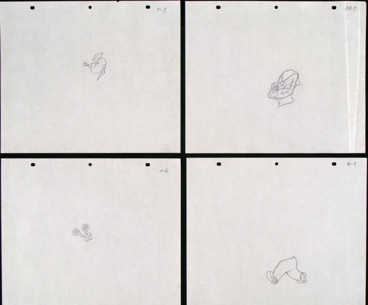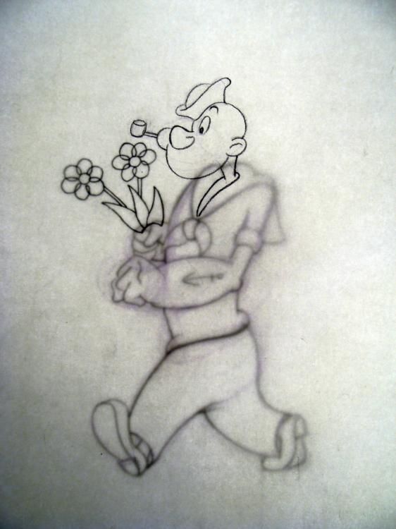 Even though there is no absolute sense of continuity in the stories, certain plot and presentation elements remain mostly constant, including purposeful contradictions in Popeye's capabilities. Though at times he seems bereft of manners or uneducated, Popeye is often depicted as capable of coming up with solutions to problems that (to the police, or, most importantly, the scientific community) seem insurmountable. Popeye has, alternatively, displayed Sherlock Holmes-like investigative prowess, scientific ingenuity (as his construction, within a few hours, of a "spinach-drive" spaceship), or oversimplified (yet successful) diplomatic argumentation (by presenting to diplomatic conferences his own existence --- and superhuman strength --- as the only true guarantee of world peace). Popeye's pipe also proves to be highly versatile. Among other things, it has served as a cutting torch, jet engine, propeller, periscope, and, of course, a whistle with which he produces his trademark toot. Olive is sure in for a great surprise... **The drawing is from the 1950's Popeye television show seriesOriginal Animation Drawing- multi-layer drawing with matching sheets on each pageOriginal "rough" animation drawing in black pencil, with notations in blackOverall size is a 12-field drawing that is 10 1/2" x 12 1/2"Very good condition; the drawing is missing Popeye's mouthTraditional animation is a multi-step process which includes various types of art techniques. Drawings are a key part of the process, in which the animator creates the design and movement of the characters. Drawings are then transferred onto acetate cels (by hand-inking and/or photo copying) to create a production cel, which is then hand painted on the back side, using paint colors chosen and approved by the creator of the series. The drawing is ready to be matted and framed. The animator's notations are located at the top of the drawing.