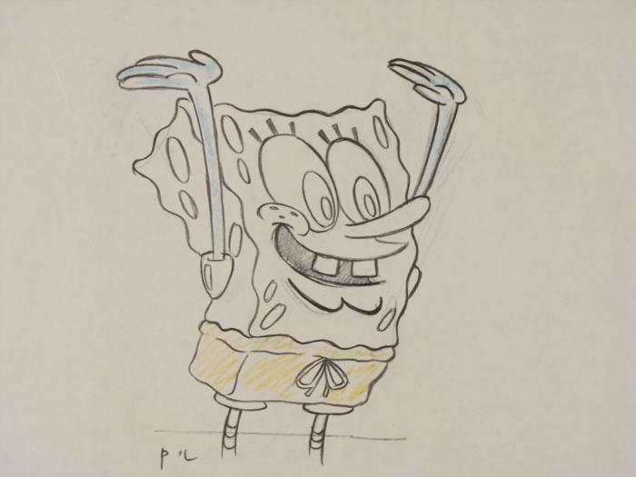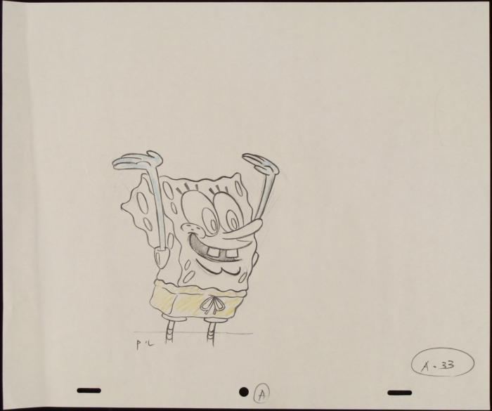 This original animation art pencil drawing was done for SpongeBob Squarepants. The notations say: A-33, and A. Shown here is SpongeBob with his hands raised over his head.The story takes place under the deep blue sea in Bikini Bottom, where SpongeBob resides. SpongeBob, who is a yellow, porous sponge, is your typical happy-go-lucky character, as he is always cheerful and enjoys making people laugh. Patrick Star, SpongeBob's neighbor who is a starfish, is your average children's show idiot, as he boasts knowing nothing and is often getting himself into ridiculous situations. Between the homes of these two lies the home of the miserable Squidward, a squid, who is known for being grouchy and playing tricks on SpongeBob and Patrick. Both SpongeBob and Squidward work at the Krusty Krab, a fast food business run by the greedy money-loving Mr. Krabs, a crab, the arch rival of the evil, possibly misunderstood, Plankton. Another neighbor, Sandy Cheeks, an athletic squirrel who normally wears an astronaut's space suit, was introduced in "Tea at the Treedome." She spends most of her time inventing and experimenting. Original "rough" animation drawing, in non-photo blue and black and yellow with the notations in black.Overall size is a 12-field drawing that is 10 1/2" × 12 1/2" Excellent condition Traditional animation is a multi-step process which includes various types of art techniques. Drawings are a key part of the process, in which the animator creates the design and movement of the characters. Drawings are then transferred onto acetate cels (by hand-inking and/or photo copying) to create a production cel, which is then hand painted on the back side, using paint colors chosen and approved by the creator of the series. This drawing is ready to framed and matted. The animator's notations are shown at the top and bottom of the drawing.