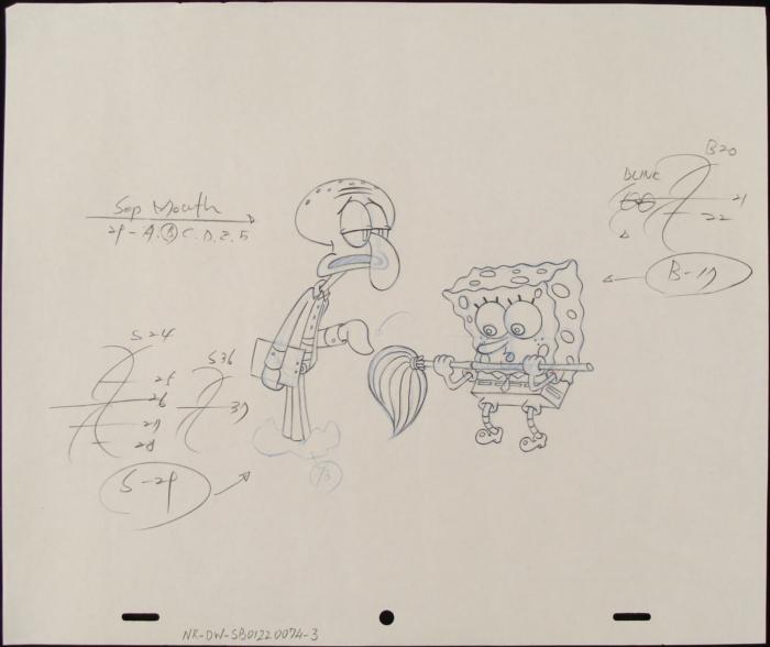 This original animation art pencil drawing was done for SpongeBob Squarepants. The notations say various letters and numbers. Shown here is SpongeBob holding a mop.The story takes place under the deep blue sea in Bikini Bottom, where SpongeBob resides. SpongeBob, who is a yellow, porous sponge, is your typical happy-go-lucky character, as he is always cheerful and enjoys making people laugh. Patrick Star, SpongeBob's neighbor who is a starfish, is your average children's show idiot, as he boasts knowing nothing and is often getting himself into ridiculous situations. Between the homes of these two lies the home of the miserable Squidward, a squid, who is known for being grouchy and playing tricks on SpongeBob and Patrick. Both SpongeBob and Squidward work at the Krusty Krab, a fast food business run by the greedy money-loving Mr. Krabs, a crab, the arch rival of the evil, possibly misunderstood, Plankton. Another neighbor, Sandy Cheeks, an athletic squirrel who normally wears an astronaut's space suit, was introduced in "Tea at the Treedome." She spends most of her time inventing and experimenting. Original "rough" animation drawing, in non-photo blue and black with the notations in black and non-photo blue. Overall size is a 12-field drawing that is 10 1/2" × 12 1/2" Excellent condition Traditional animation is a multi-step process which includes various types of art techniques. Drawings are a key part of the process, in which the animator creates the design and movement of the characters. Drawings are then transferred onto acetate cels (by hand-inking and/or photo copying) to create a production cel, which is then hand painted on the back side, using paint colors chosen and approved by the creator of the series. This drawing is ready to framed and matted. The animator's notations are shown at the top and bottom of the drawing.