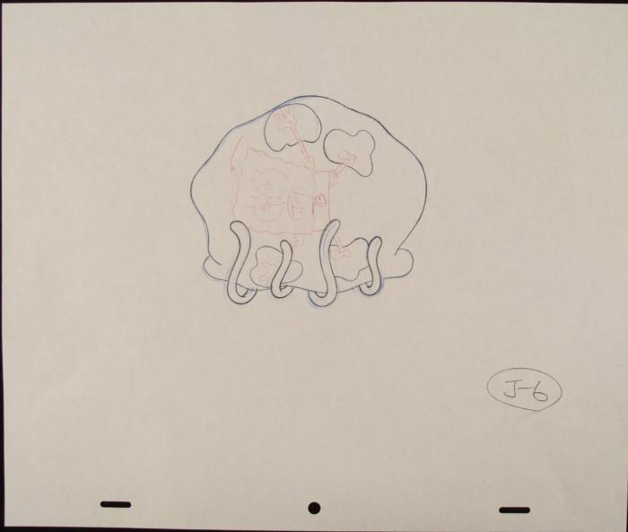 This original animation art pencil drawing was done for SpongeBob Squarepants. The notations are on Spongebob and at the bottom. In this drawing, SpongeBob appears to be stuck inside a jellyfish.The story takes place under the deep blue sea in Bikini Bottom, where SpongeBob resides. SpongeBob, who is a yellow, porous sponge, is your typical happy-go-lucky character, as he is always cheerful and enjoys making people laugh. Patrick Star, SpongeBob's neighbor who is a starfish, is your average children's show idiot, as he boasts knowing nothing and is often getting himself into ridiculous situations. Between the homes of these two lies the home of the miserable Squidward, a squid, who is known for being grouchy and playing tricks on SpongeBob and Patrick. Both SpongeBob and Squidward work at the Krusty Krab, a fast food business run by the greedy money-loving Mr. Krabs, a crab, the arch rival of the evil, possibly misunderstood, Plankton. Another neighbor, Sandy Cheeks, an athletic squirrel who normally wears an astronaut's space suit, was introduced in "Tea at the Treedome." She spends most of her time inventing and experimenting. Original "rough" animation drawing, in black, red, and blue pencil with the notations in black and red. Overall size is a 12-field drawing that is 10 1/2" × 12 1/2" Excellent condition Traditional animation is a multi-step process which includes various types of art techniques. Drawings are a key part of the process, in which the animator creates the design and movement of the characters. Drawings are then transferred onto acetate cels (by hand-inking and/or photo copying) to create a production cel, which is then hand painted on the back side, using paint colors chosen and approved by the creator of the series. This drawing is ready to framed and matted. The animator's notations are shown at the bottom of the drawing.