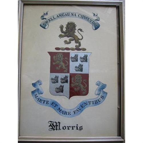 then reads "Morris Arms :- quarterly, 1st and 4th Guiles. A LION RAMPANT, Quadrant, or; (gold) 2nd and 3rd, argent (silver) - THREE BOARS' HEADS coupled sable ".