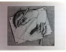 M. C. Escher Drawing hands, 1948 Lithograph "A right hand is busy sketching a shirt-cuff upon a drawing paper. At this point its work is incomplete, but a little further to the right it has already drawn a left hand emerging from a sleeve in such detail that this hand has come right up out of the flat surface, and in its turn it is sketching the cuff from which the right hand is emerging, as though it were a living member." M. C. Escher