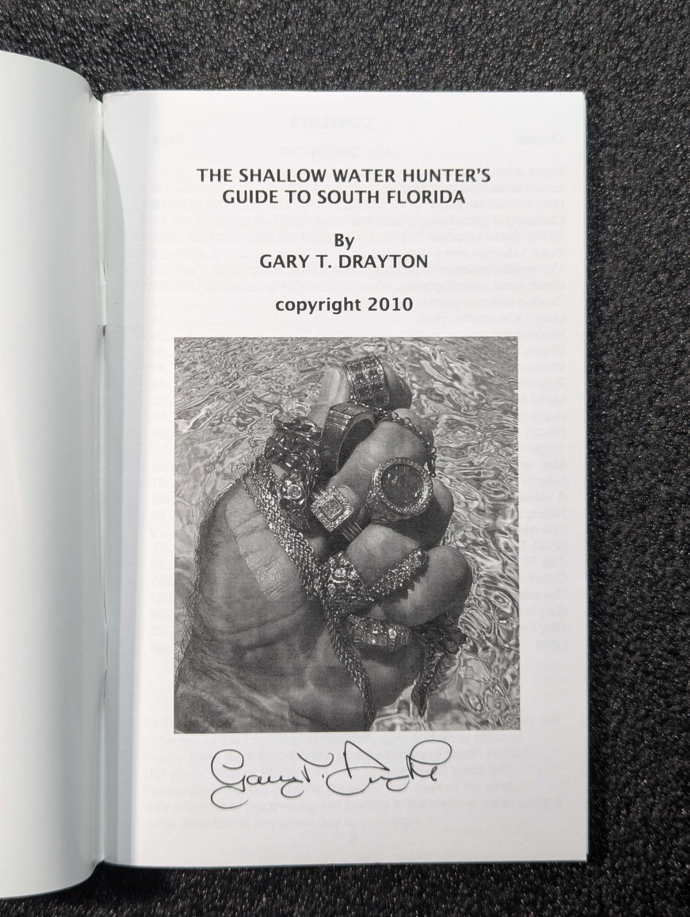 Drayton, Gary T. THE SHALLOW WATER HUNTER'S GUIDE TO SOUTH FLORIDA. Gary Drayton. 2010. 12mo. 94, (2) pages. original pictorial card covers. Signed by the author. Diagrams. B&w photos throughout. English text. The David Baker Library. Fine. This guide shows you the best places to find jewelry and coins in South Florida, with detailed information on popular tourist beach treasure hunting hot spots. Lot weight: 0 lbs 5oz. Subject(s): Metal Detecting, Treasure Hunting.