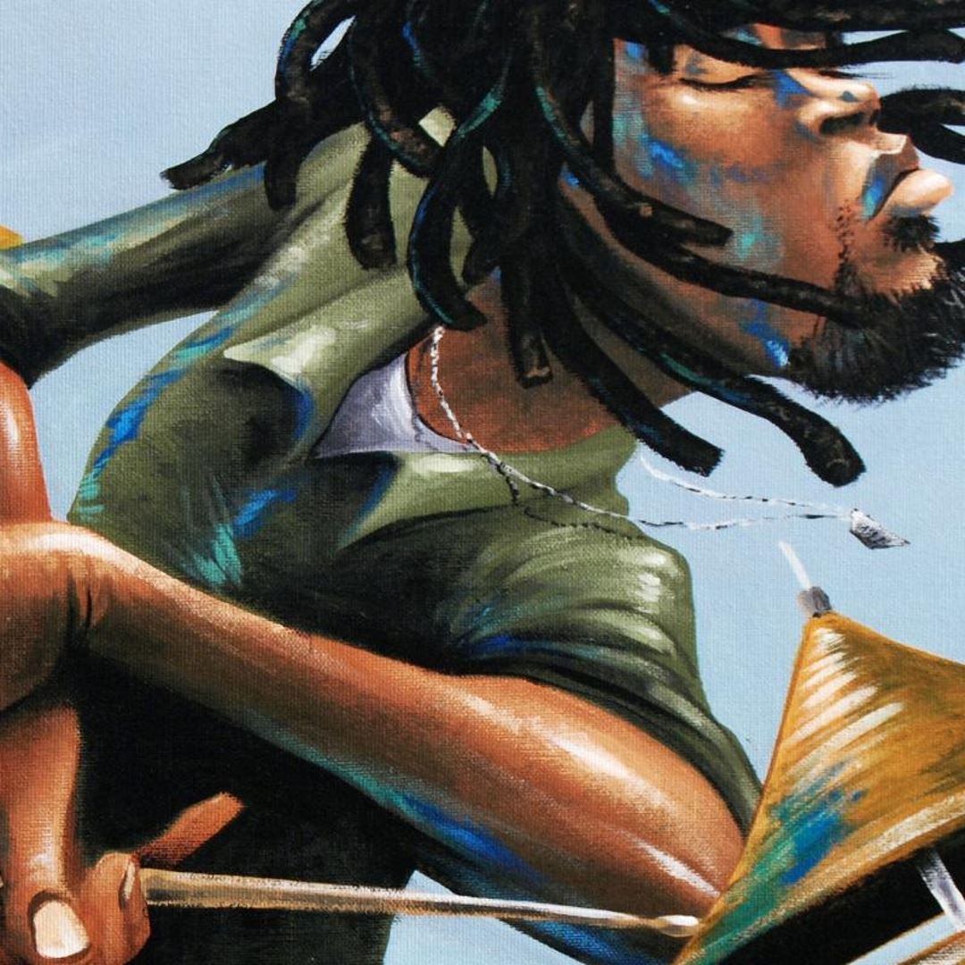 Combining his passions for music and art, David Garibaldi creates visual poetry. "Dreads And Drums" is a limited edition giclee on stretched canvas, CC numbered from the miniature series and bearing the artist's authorized signature. This piece is gallery wrapped and ready to hang. Includes Certificate of Authenticity! Measures approx. 18" x 12" (image).