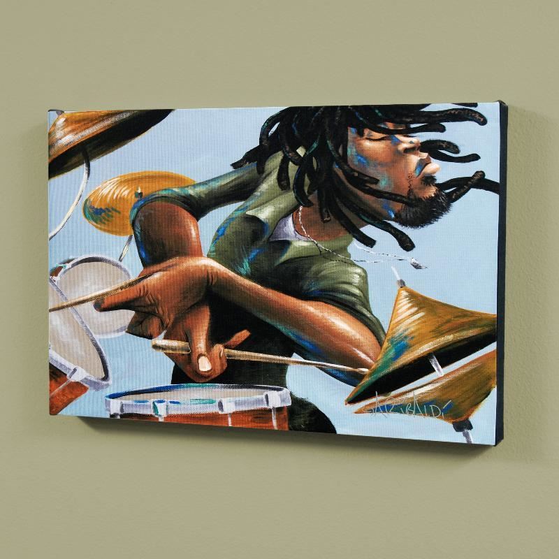 Combining his passions for music and art, David Garibaldi creates visual poetry. "Dreads And Drums" is a limited edition giclee on stretched canvas, AP numbered and bearing the artist's authorized signature. This piece comes gallery wrapped. Includes Certificate of Authenticity! Measures approx. 30" x 24" (image).