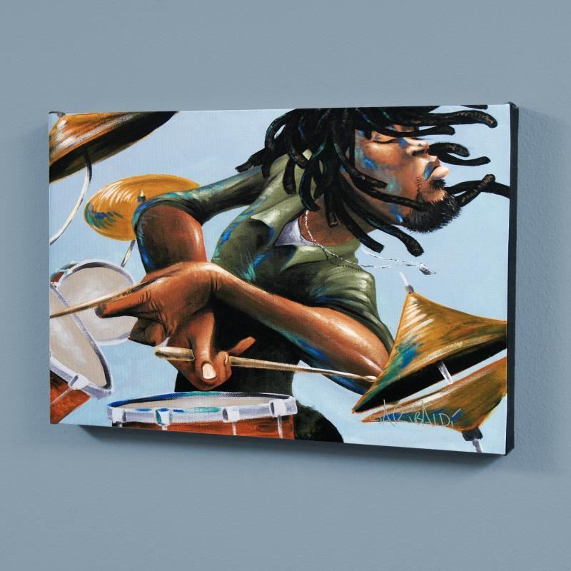 Combining his passions for music and art, David Garibaldi creates visual poetry. "Dreads And Drums" is a limited edition giclee on stretched canvas, CC numbered from the miniature series and bearing the artist's authorized signature. This piece comes gallery wrapped. Includes Letter of Authenticity. Measures approx. 18" x 12" (image).