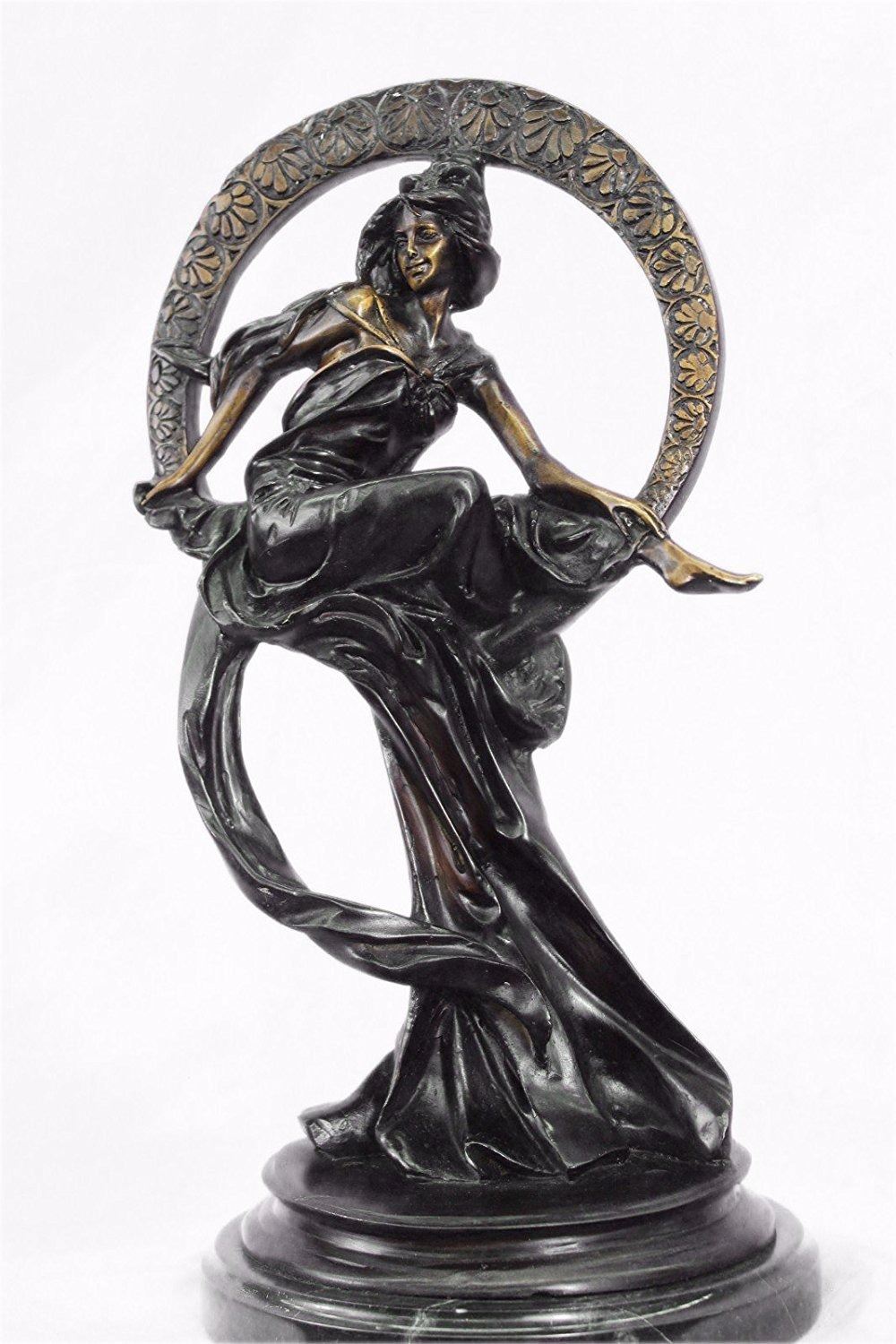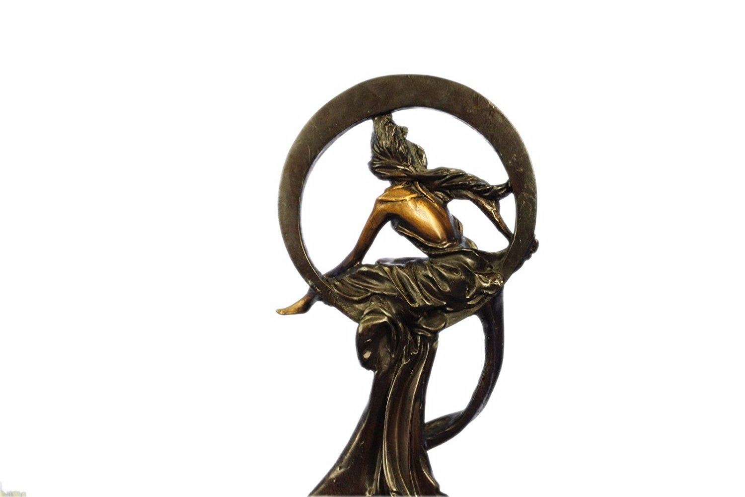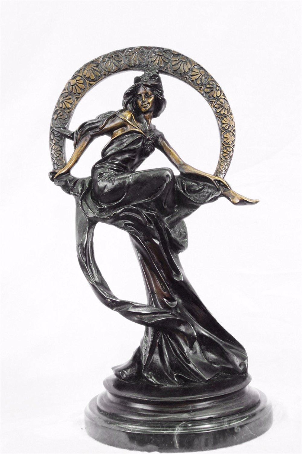 The attentions to the intricate details of these luxurious works of art are amazing and the brilliance of the figures unsurpassed. This dream goddess sits in a ring of bliss that is filled with a loving warm energy. Her beautifully long dress wanders away in the wind, almost as if it is doing a small dance to the dreams of the night. Her hair blows softly in the wind and creates a great captured motion. She has unbelievable beauty and gives off the ora of bliss and love. Her face is that of an angel and she sits in the most gorgeously detailed ring, watching over the dreams of the world. She was cast using the Lost Wax Method and has a gorgeous two toned brown patina. Bronze Dimensions with Marble Base: Height 17 X Width 10 inches. Weight: 15 LBS. Inventory: 655625662M56