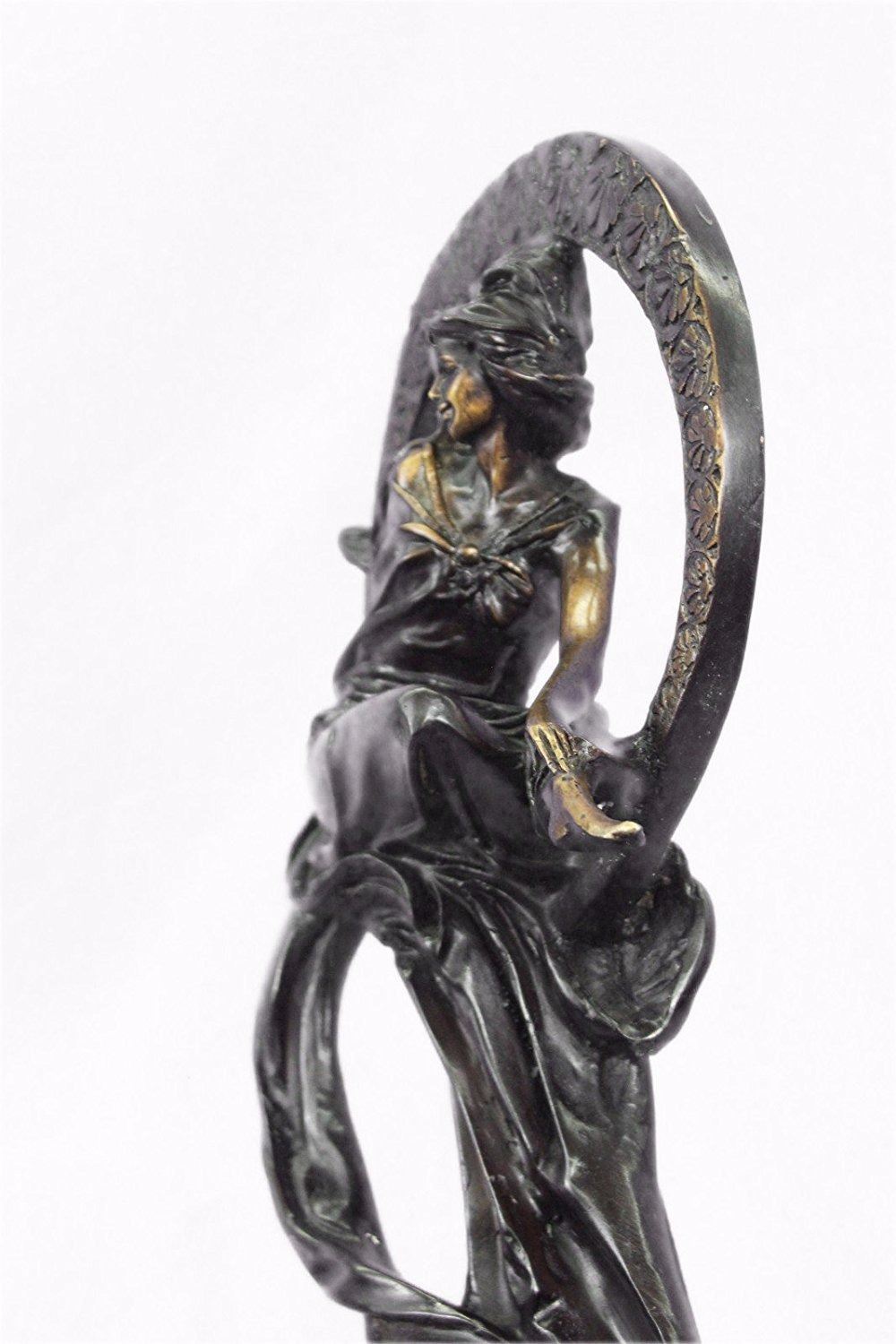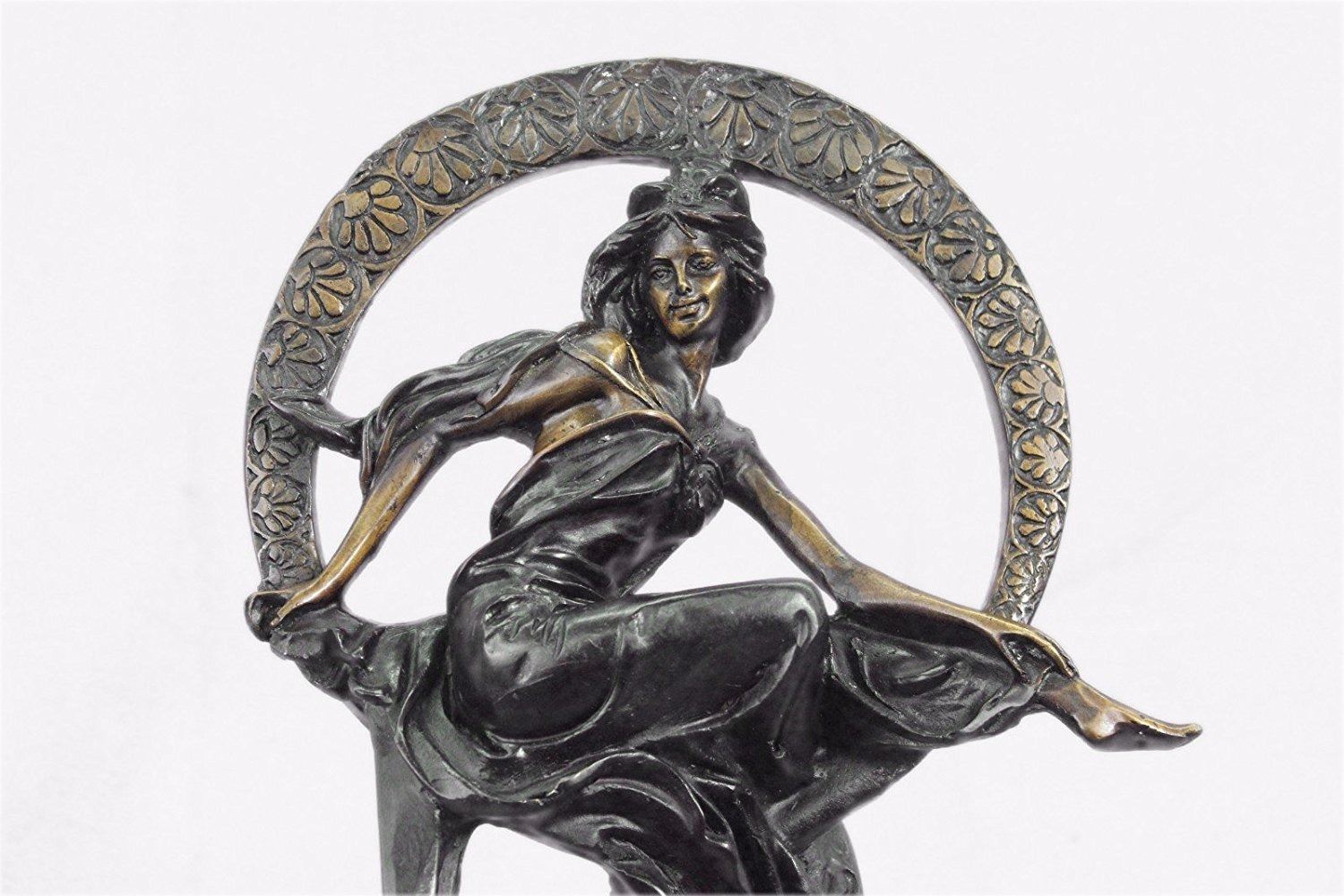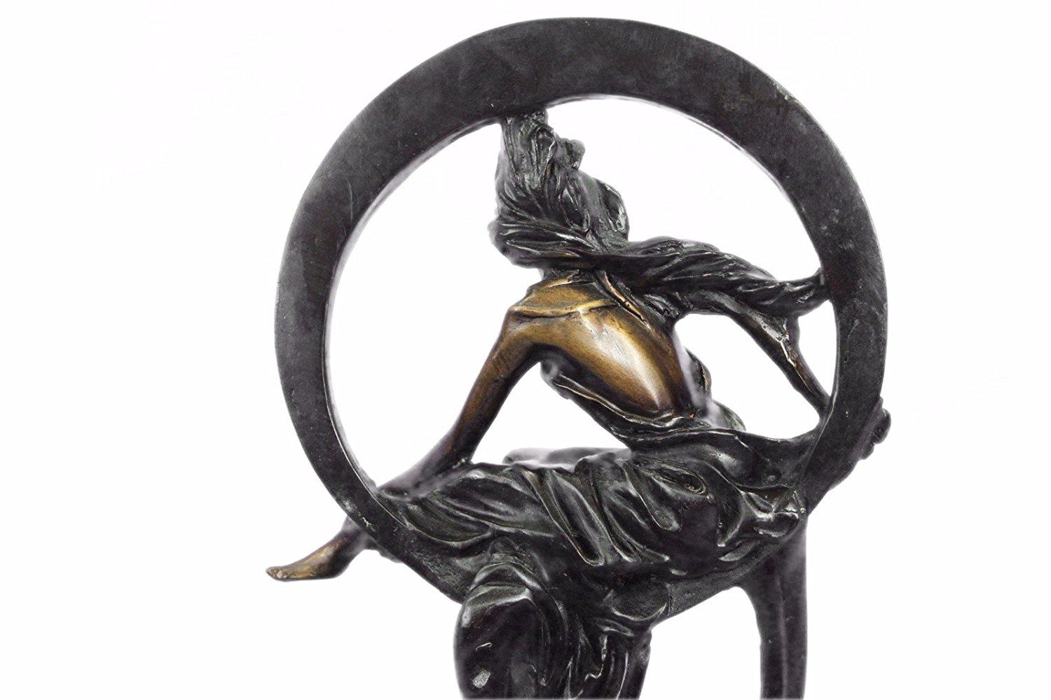 The attentions to the intricate details of these luxurious works of art are amazing and the brilliance of the figures unsurpassed. This dream goddess sits in a ring of bliss that is filled with a loving warm energy. Her beautifully long dress wanders away in the wind, almost as if it is doing a small dance to the dreams of the night. Her hair blows softly in the wind and creates a great captured motion. She has unbelievable beauty and gives off the ora of bliss and love. Her face is that of an angel and she sits in the most gorgeously detailed ring, watching over the dreams of the world. She was cast using the Lost Wax Method and has a gorgeous two toned brown patina. Bronze Dimensions with Marble Base: Height 17 X Width 10 inches. Weight: 15 LBS. Inventory: 655625662M56