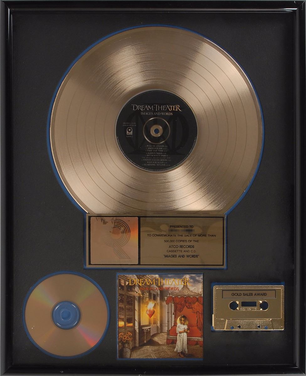 Official ‘R’ hologram-style RIAA gold sales award presented “to commemorate the sale of more than 500,000 copies of the Atco Records cassette and C.D. ‘Images and Words.’” Framed with its disc, cassette, plate, two CDs, and an image of the album cover to an overall size of 17 x 21. Award retains its original backing. In fine condition.
