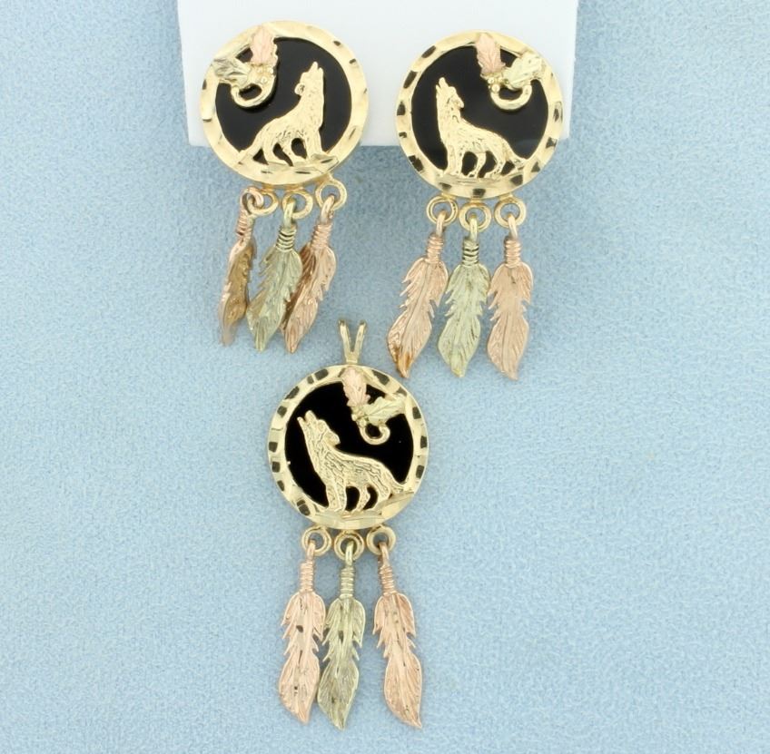 In 10K yellow, rose & green gold, each piece contains a 15mm round onyx gemstone. They are 1 1/2 inches long. 16.5g