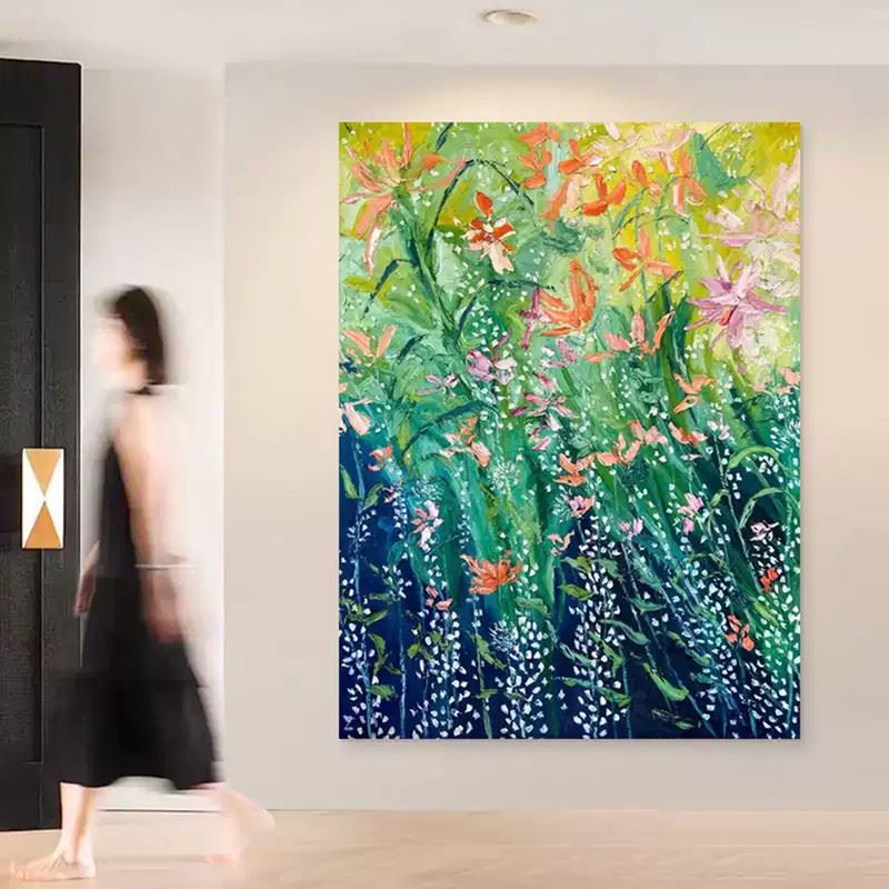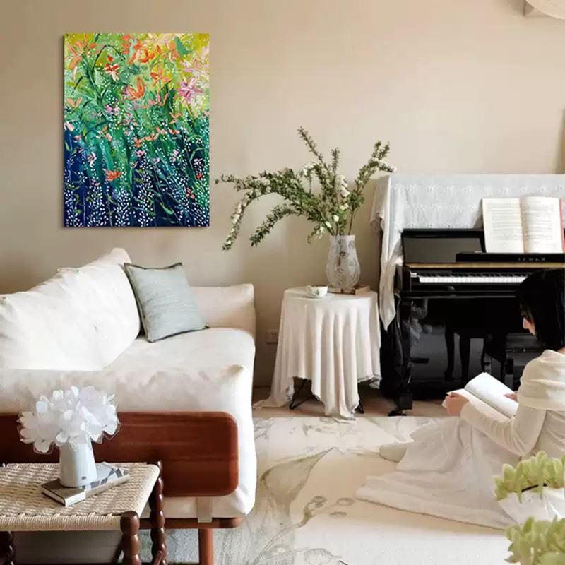 Amid intertwining greens and blues, lush blossoms dance lightly, with orange and pink petals drifting like a dream. Tiny white flowers sprinkle the ground like starlight, creating a gorgeous and romantic floral dreamscape. Dimensions: 24 x 31 inches.
