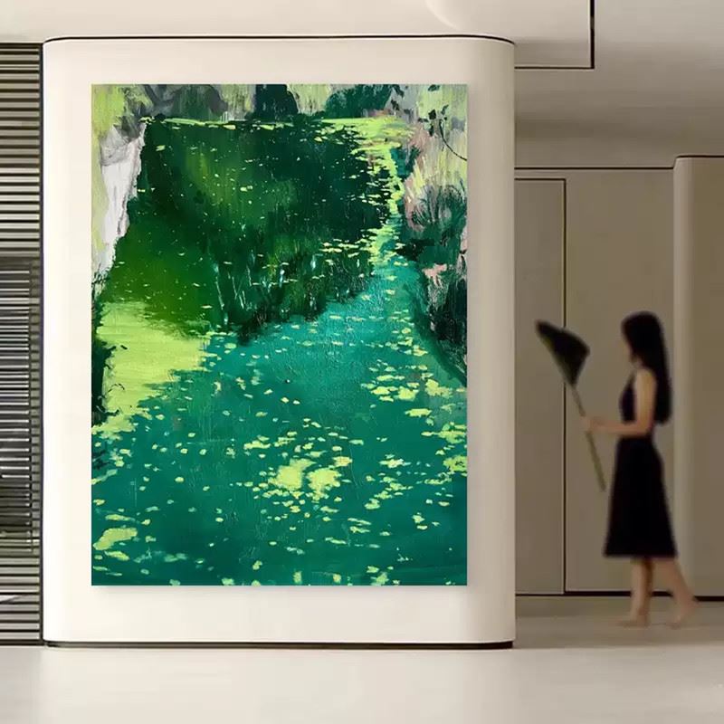 Deep green water is scattered with tiny islands of duckweed, as if a quiet dream were drifting down the hidden stream. Flickers of light dance across the surface and mingle with the foliage on the banks, weaving a tranquil and lingering vision of summer. Dimensions: 24 x 31 inches.