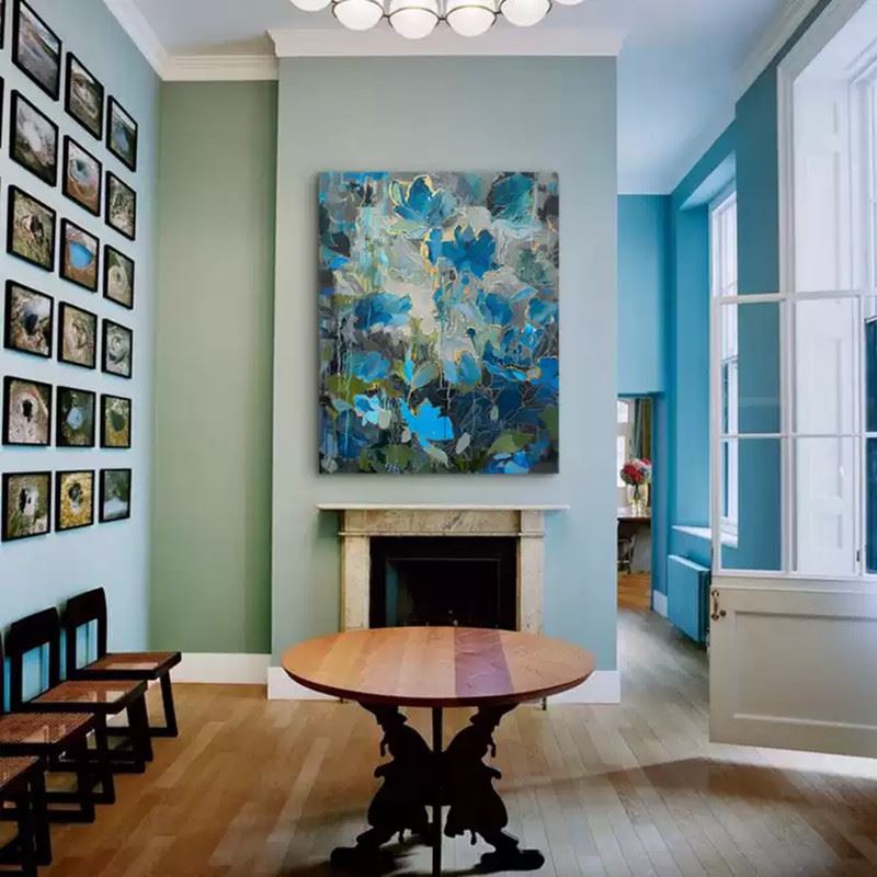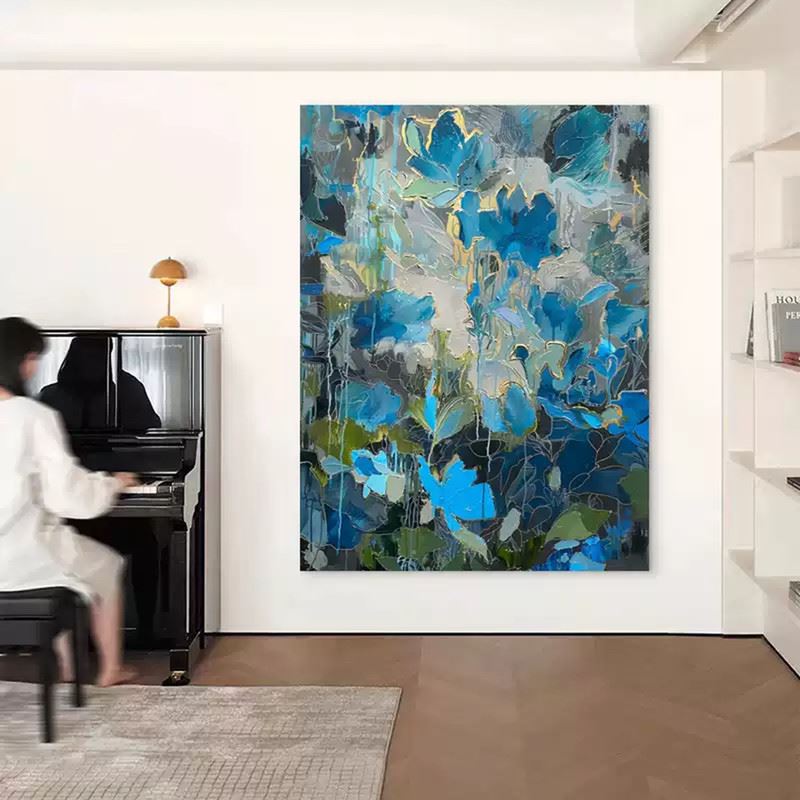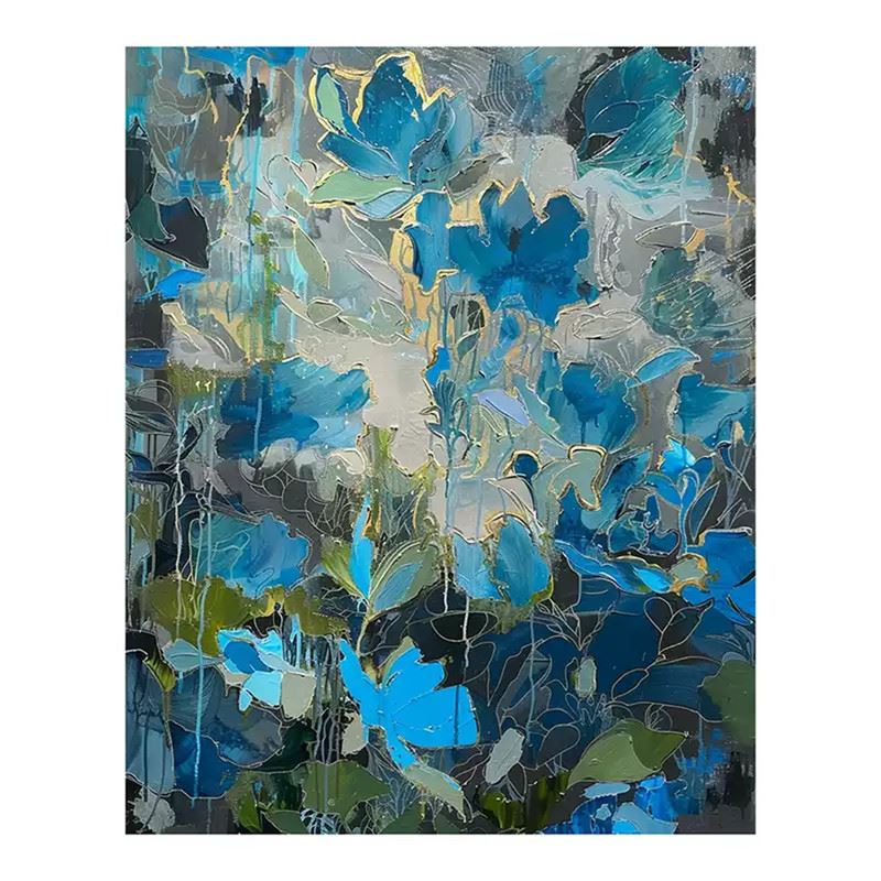 Layers of blues and greys intertwine, with petals outlined in delicate gold, like starry flowers blooming in the night sky and drifting slowly in the dark. The cool palette still carries a gentle warmth, creating a dreamlike space somewhere between deep ocean and starlit sky. Dimensions: 24 x 31 inches.
