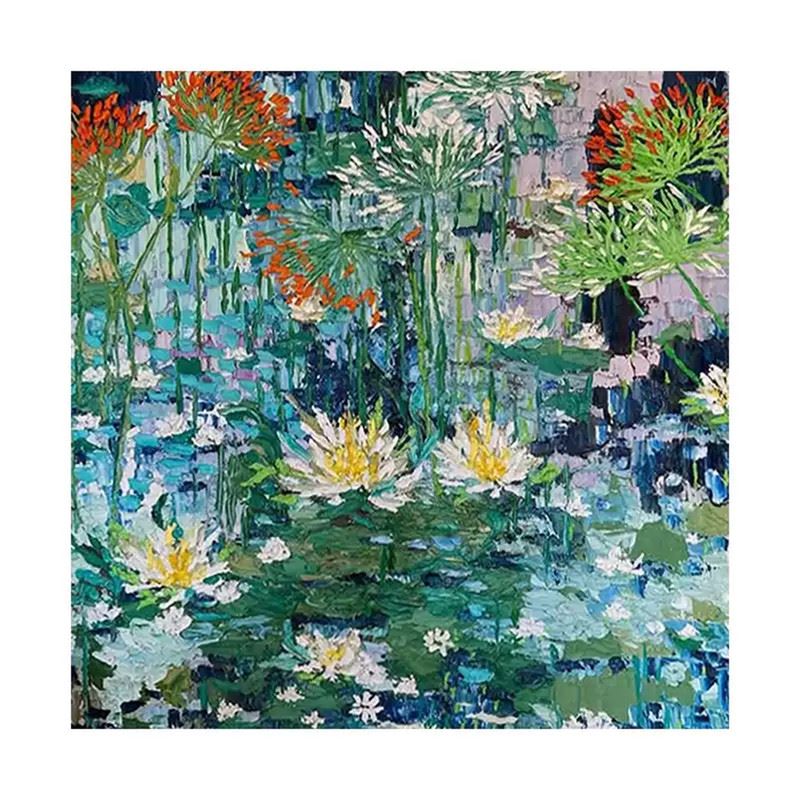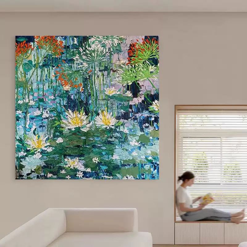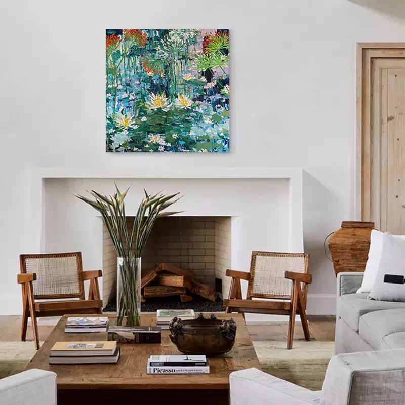 The lake surface is like a mirror, with blooming water lilies floating gently on the water. The clear pond reflects the vibrant lilies and surrounding lush green leaves. The scent of summer fills the air, and a light breeze stirs the reflections in the water, creating a dreamlike scene. Dimensions: 24 x 31 inches.