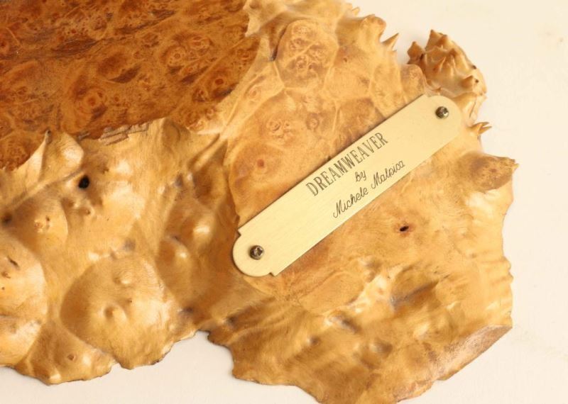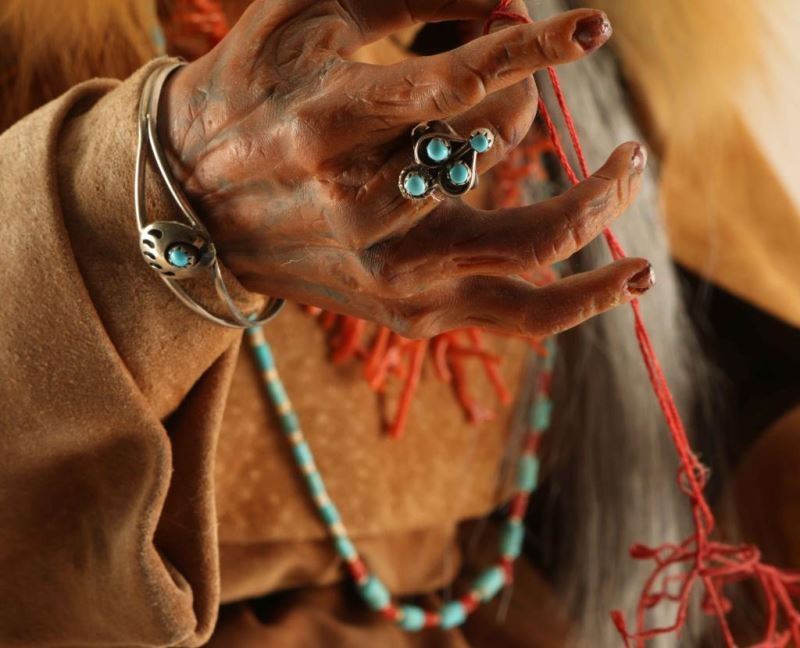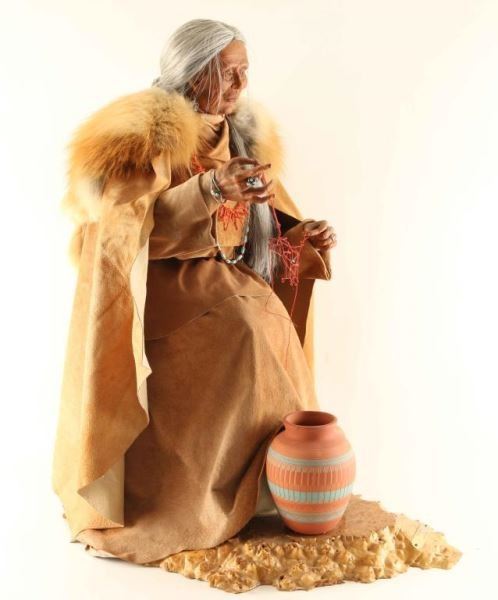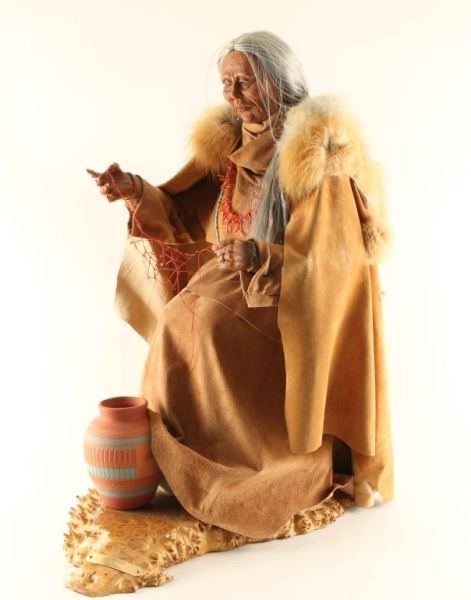 by Michelle Malpica. Seated Native American woman weaves a dreamcatcher with a turquoise center. Dressed in fur trimmed tan suede with necklaces of turquoise and branch coral accented with silver plated bracelets and dreamcatcher earrings. An incised carved clay pot sits at her feet. Very lifelike. Measures 26"x30"x19". Michelle Malpica is self taught in mixed media sculpture, this artist has been creating unique figures for 17 years. She has been nominated many times for the award of excellence. Michelle is a member of the League of New Hampshire Craftsmen and her sculptures have been exhibited at The Currier Museum of Art, The Wenham Museum, and the Stricaff Fine Art Museum. Michelle says she is inspired by the mysterious pulses of the past, transforming clay into haunting images of Native Americans. Michelle is best known for her Indians and Santas. However, she has a wide range of talents.