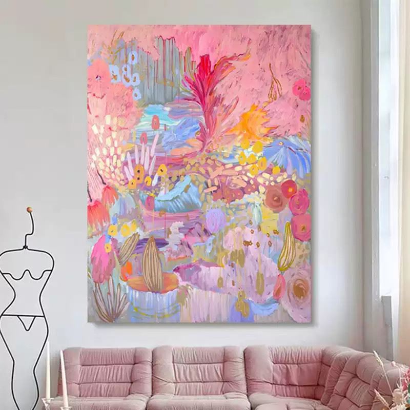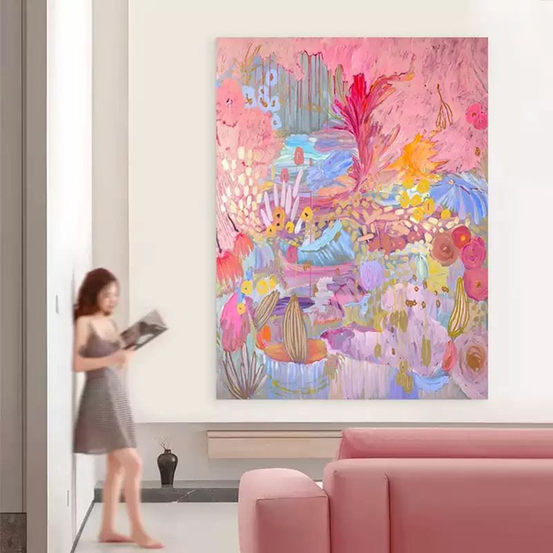 Soft pinks flood the canvas, dotted with golden and pale blue blossoms, like wandering into a light, radiant realm of flowers in a dream. Dimensions: 24 x 31 inches.
