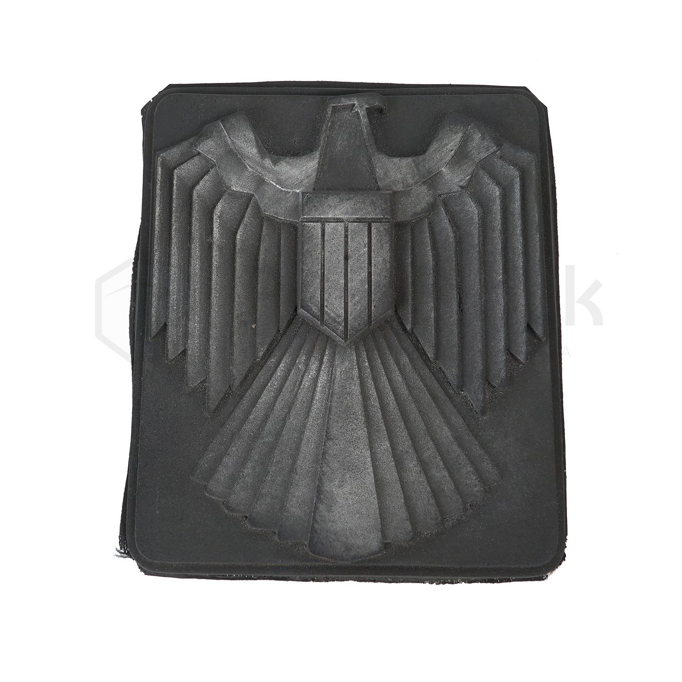 Security officer patch used in the production of the Alex Garland dystopian science fiction film Dredd. Mega City One is a vast, violent metropolis where felons rule the streets. The only law lies with cops called "judges," who act as judge, jury and executioner, and Dredd (Karl Urban) is one of the city's most feared. One day, Dredd is partnered with Cassandra (Olivia Thirlby), a rookie with powerful psychic abilities. A report of a terrible crime sends Dredd and Cassandra to a dangerous area controlled by Ma-Ma (Lena Headey), a drug lord who will stop at nothing to protect her empire. These patched were used on the shoulders of the security officers that guarded the police department. This piece is cast in urethane rubber with a raised eagle detail. This item originally sold in the studio sanctioned auction and remains in excellent, production used condition.