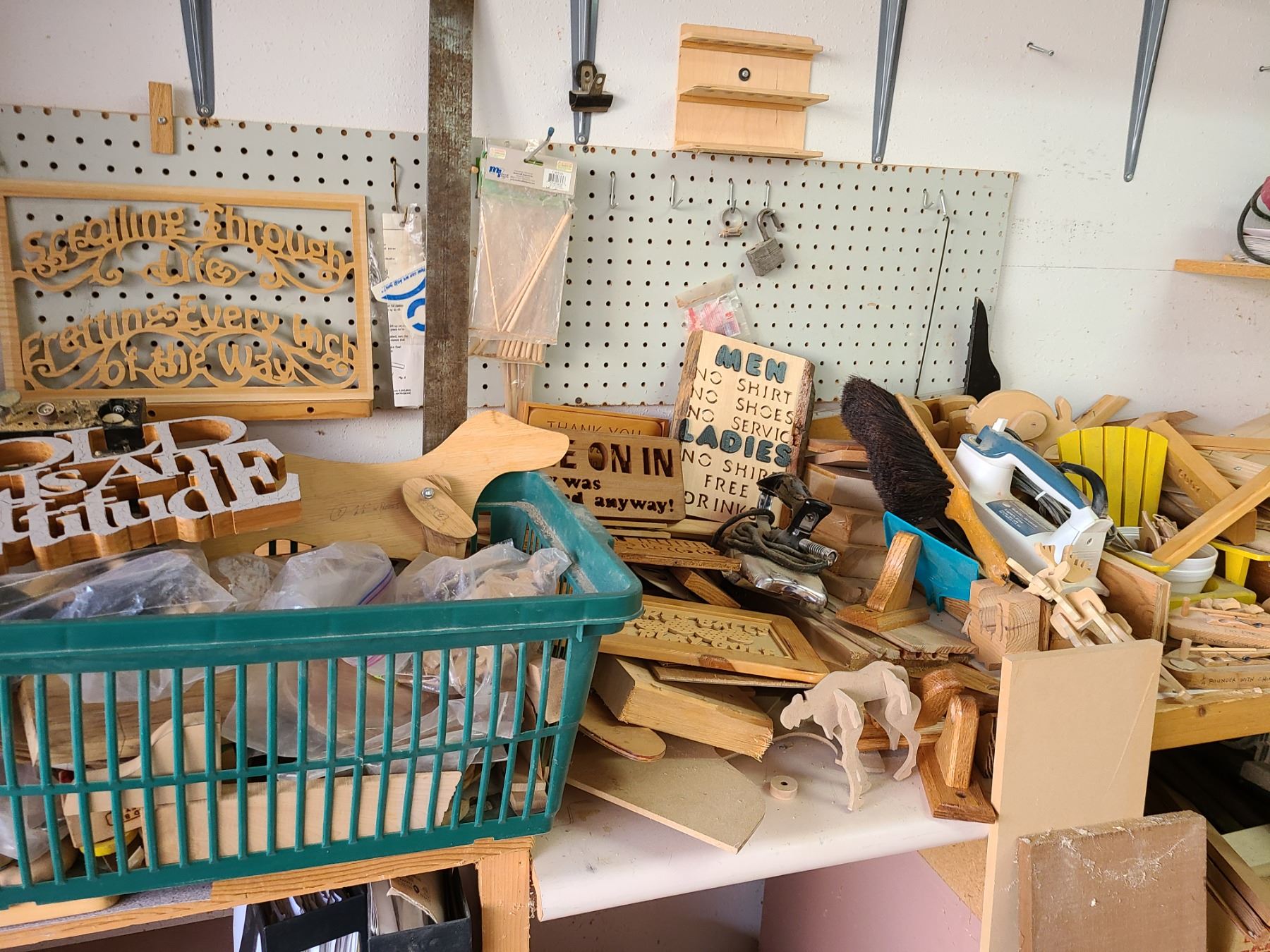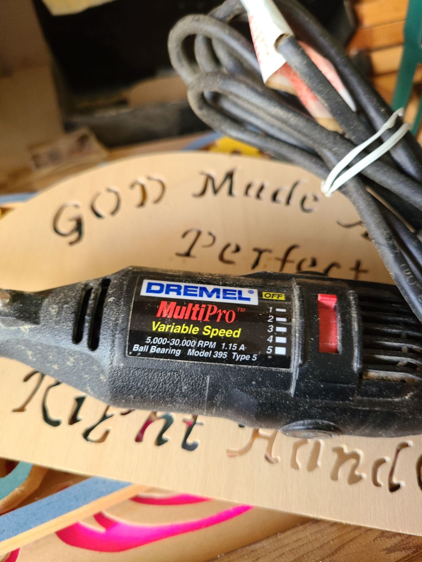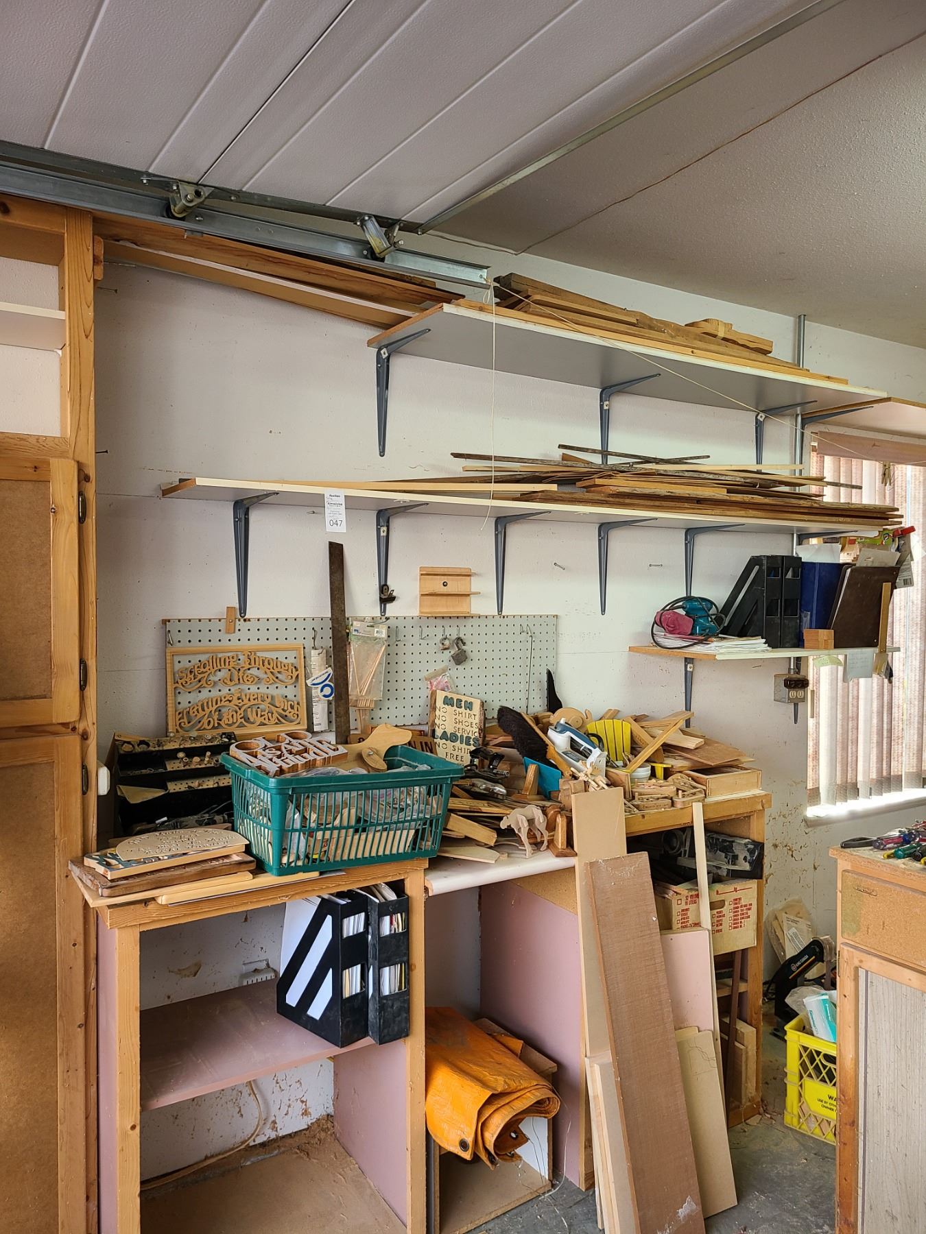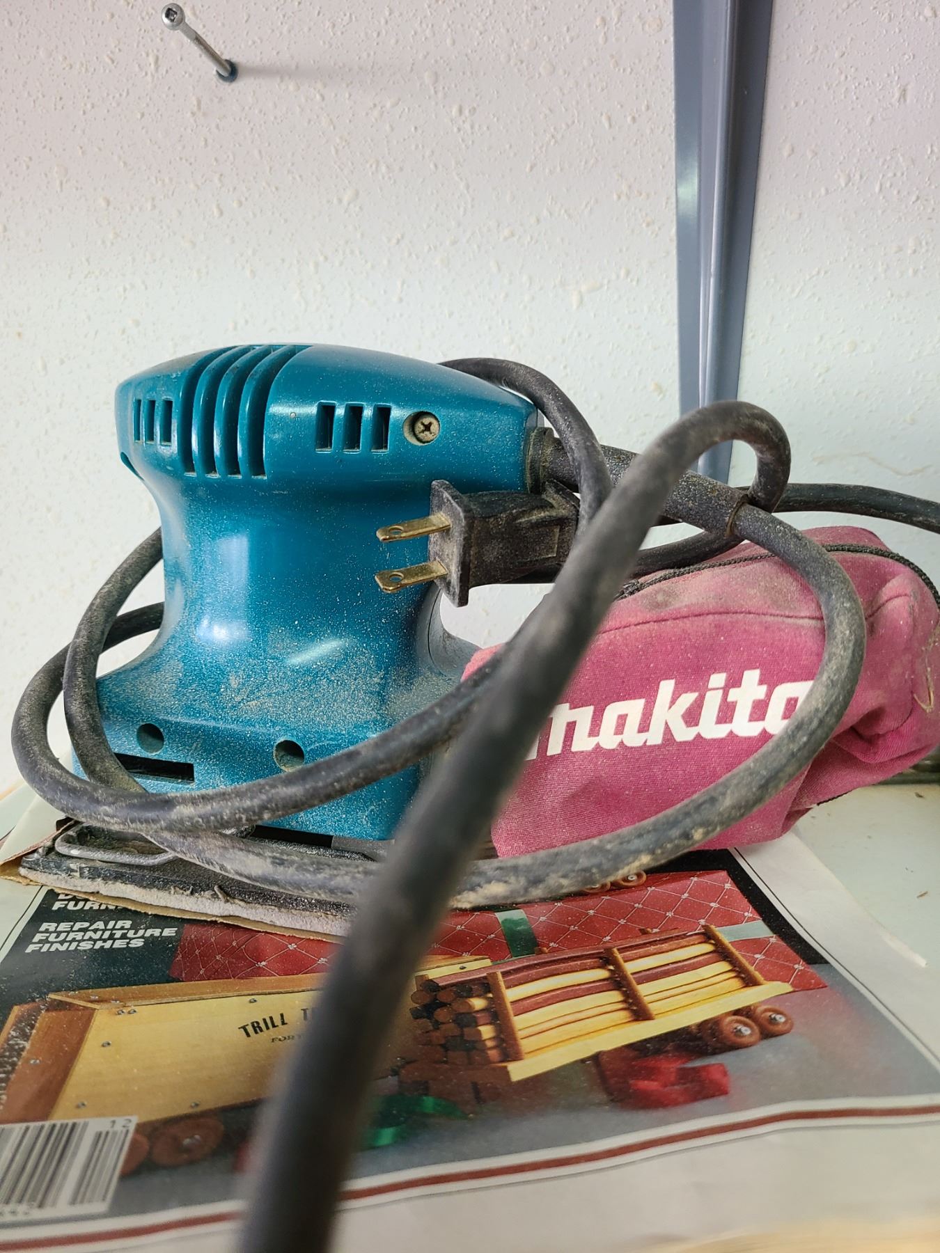 Lot includes assorted wood pieces up to 5 ft. in length, small signs, tarp, Drexel model #395 and pieces, and palm sander. Electronics untested,Pickup 9 am.