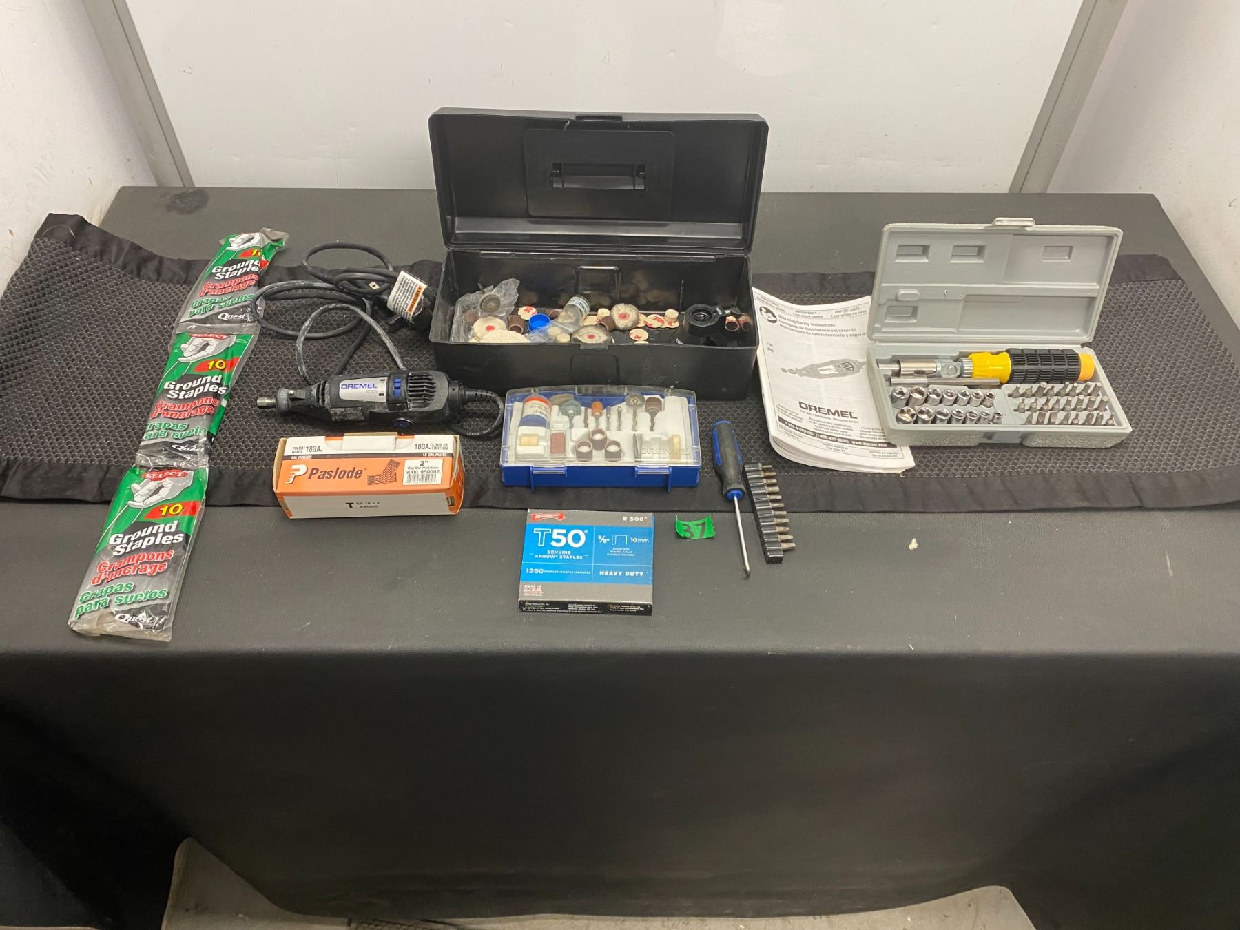 Dremel brand rotary tool with case of attachments, staples, finishing nails, driver bits, sockets an