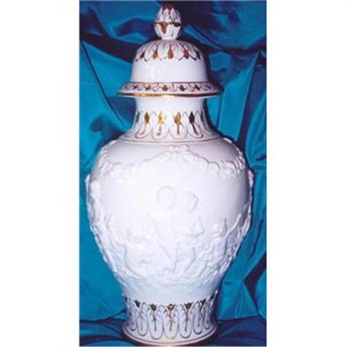 These Dresden covered urns would enhance the appearance of any room and would look marvelous on the dining room buffet. There are frolicking cherubs surround and garlands of flowers highlighted by gold gilt.