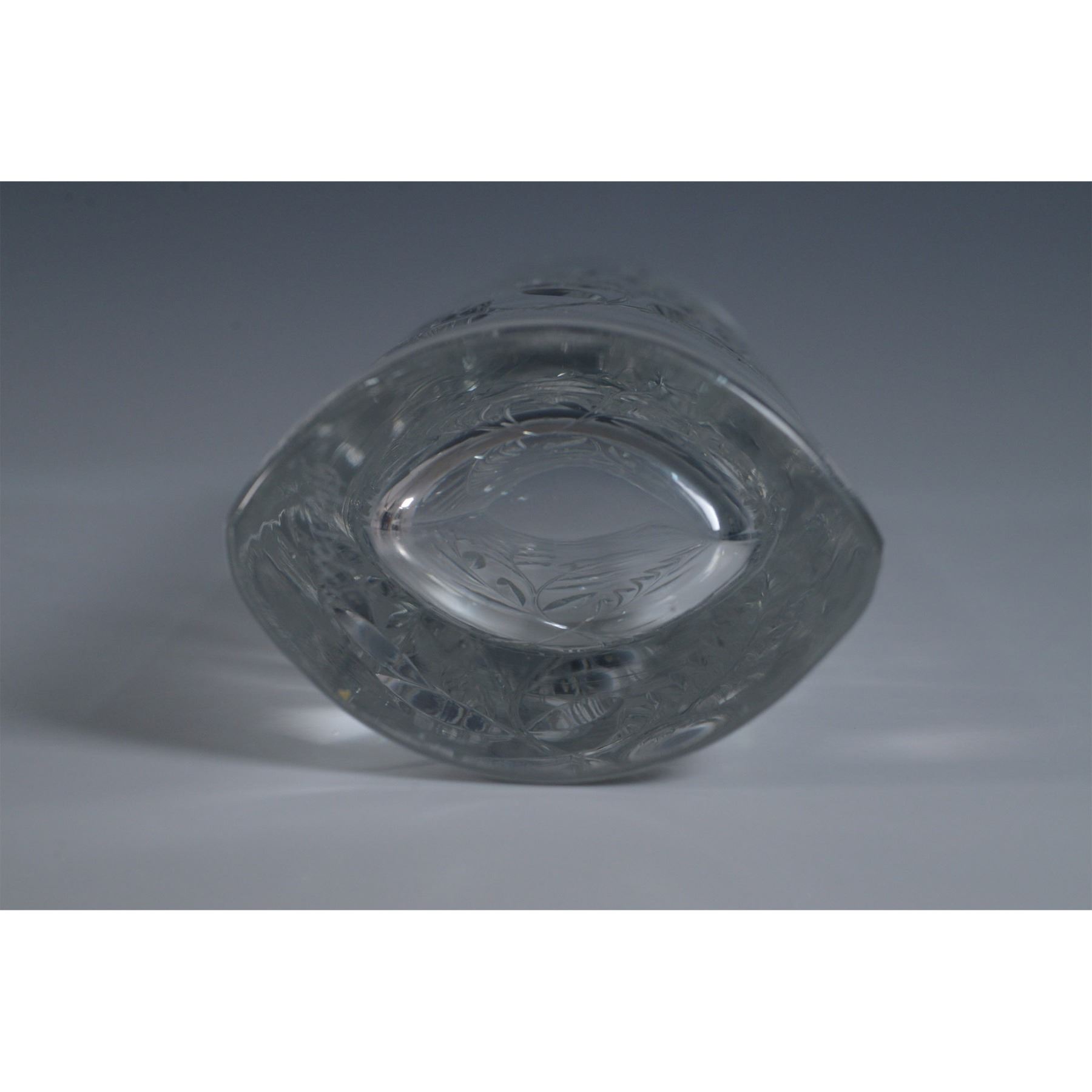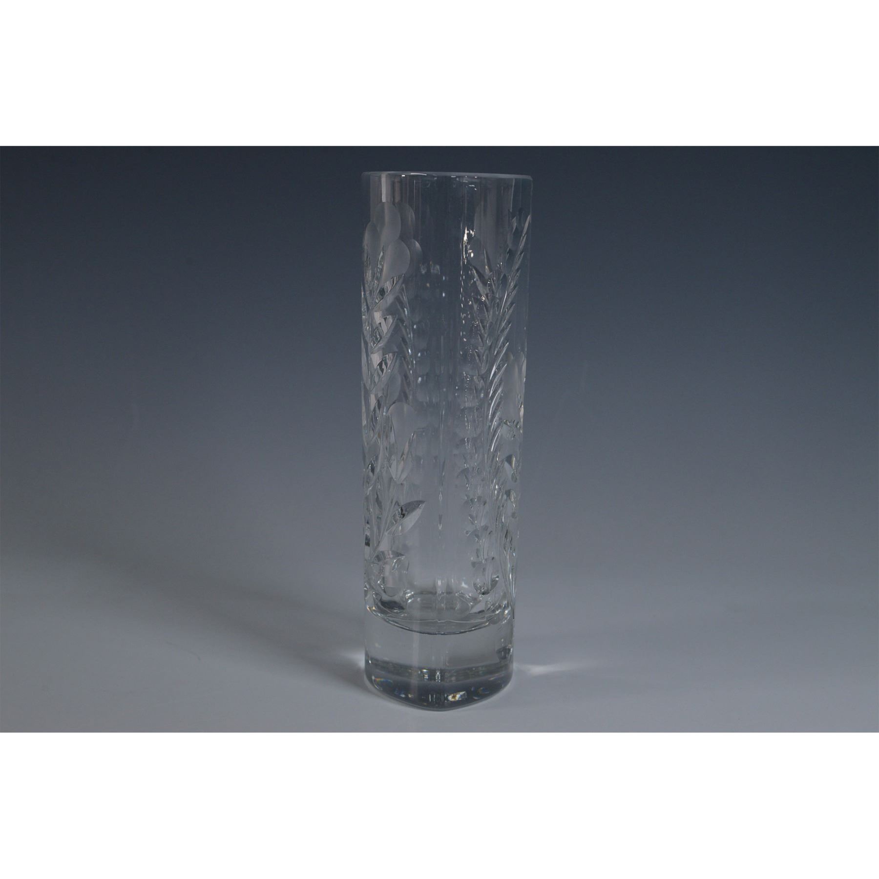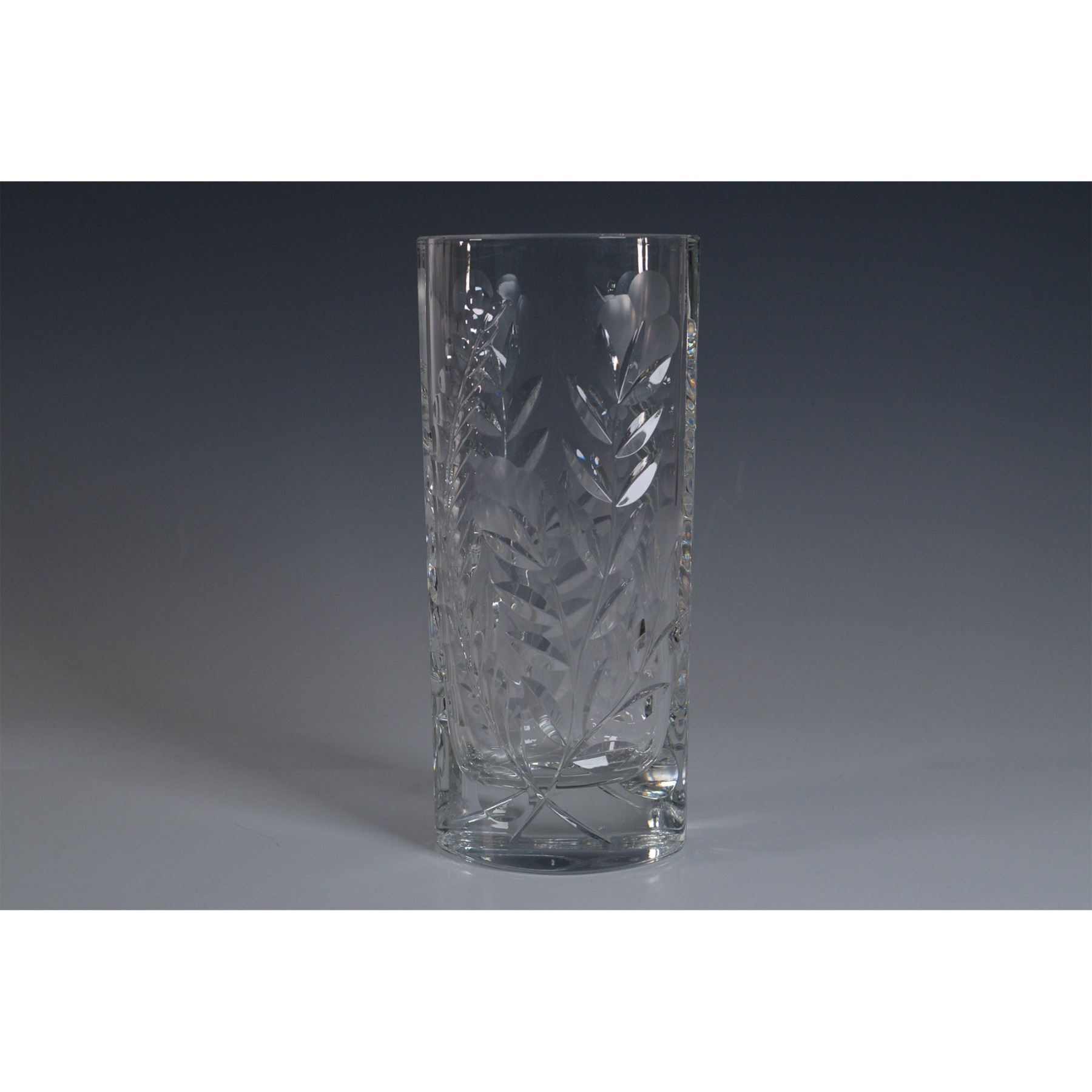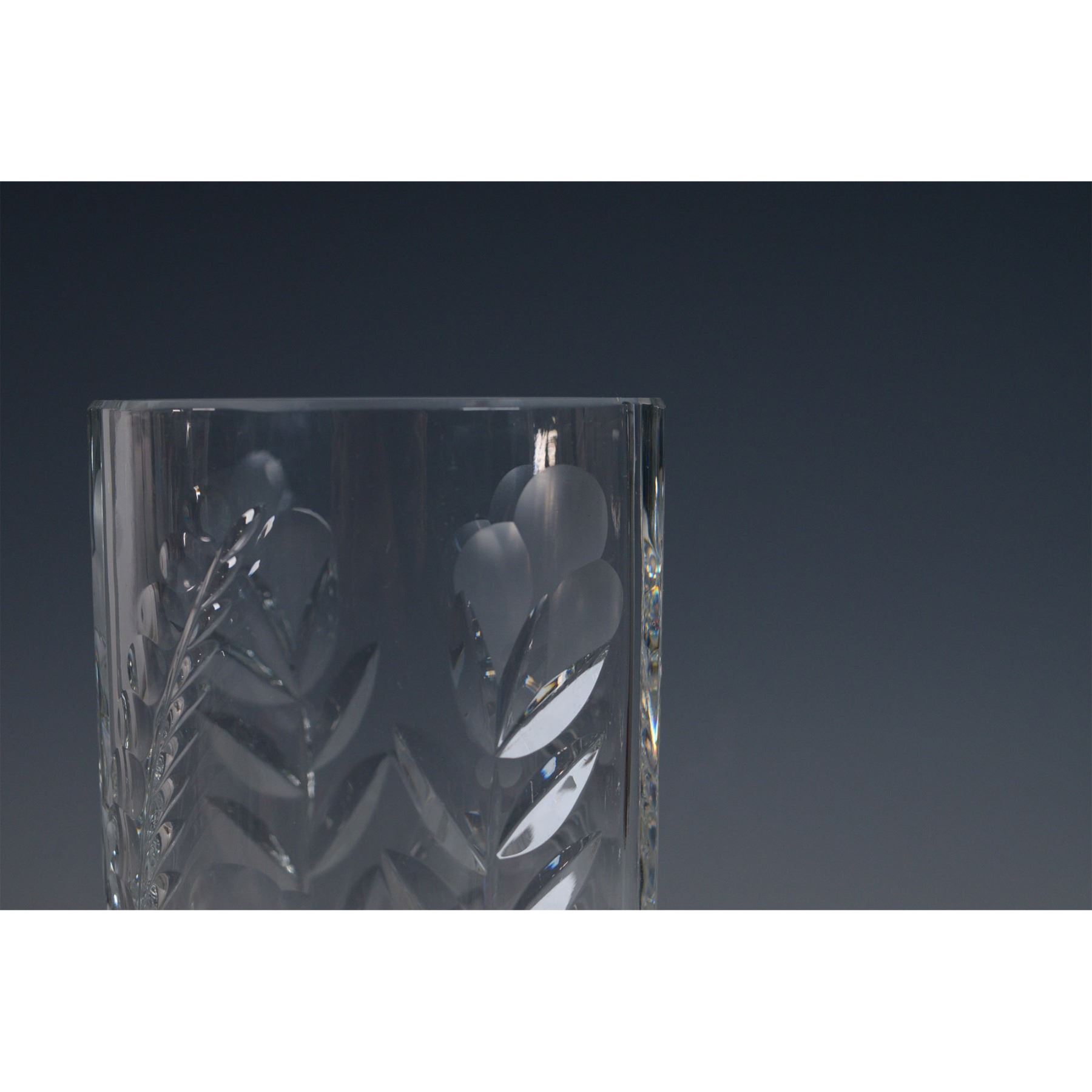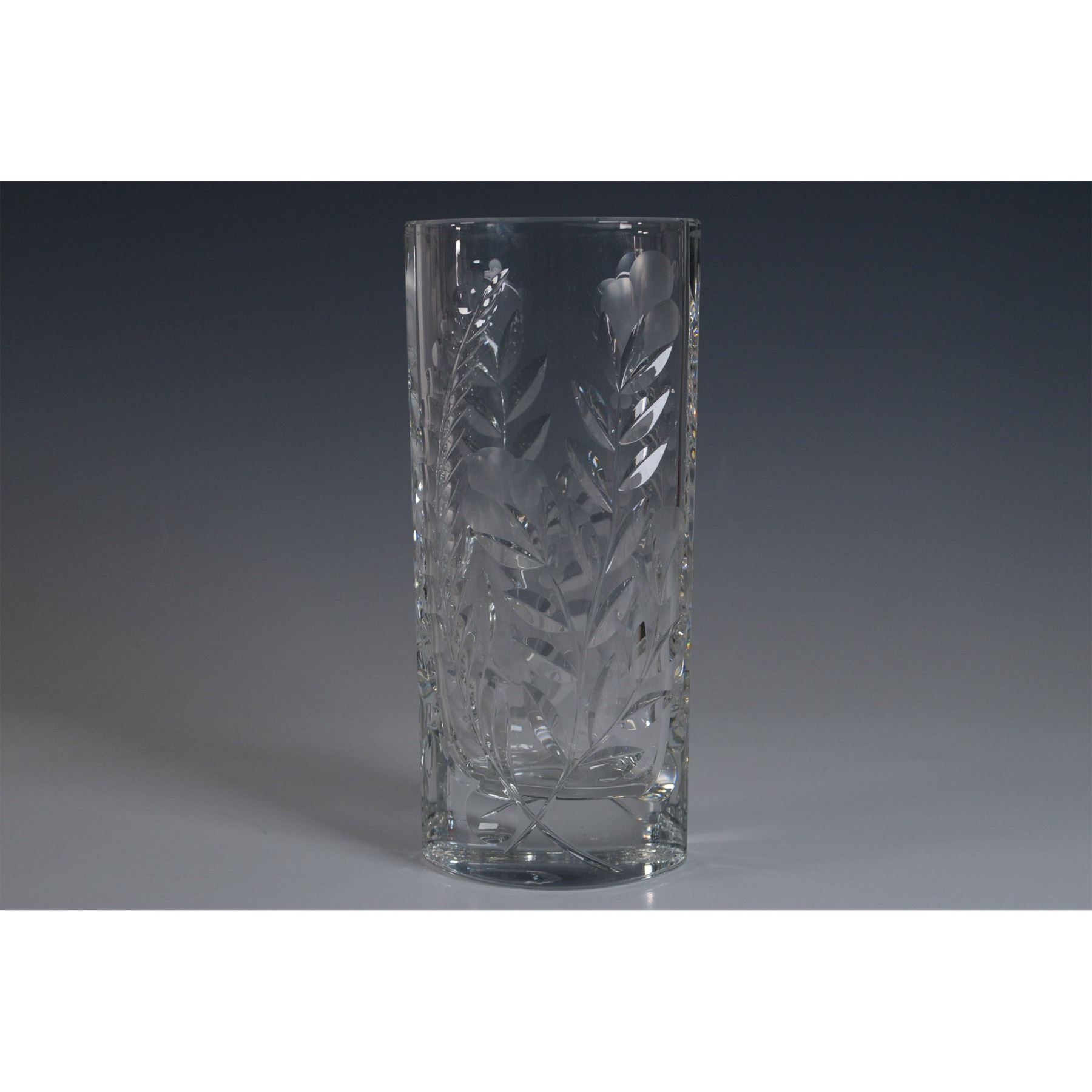 Elegant Dresden crystal cut glass vase featuring an intricate floral and foliate design. The clear crystal body showcases finely etched and cut leaves and buds, creating a striking pattern that enhances the play of light. The vase is signed Dresden on the base, signifying its craftsmanship and quality. With a thick, weighted base for stability, this piece exemplifies fine European glassmaking. A beautiful addition to any collection or home decor.