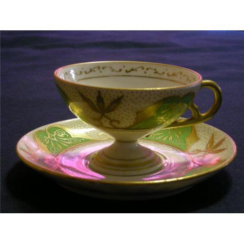</font></strong>Pedestal cup with unusual handle, 2.75" w x 1 3/4"h, saucer 4 1/4"; cream with green and gold enamel. Gold enamel accented in some places with a little gold beading. </font>