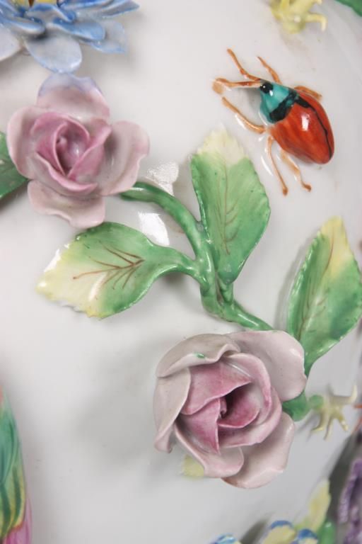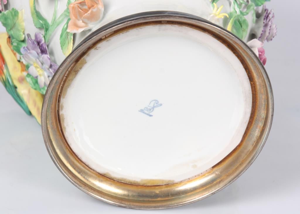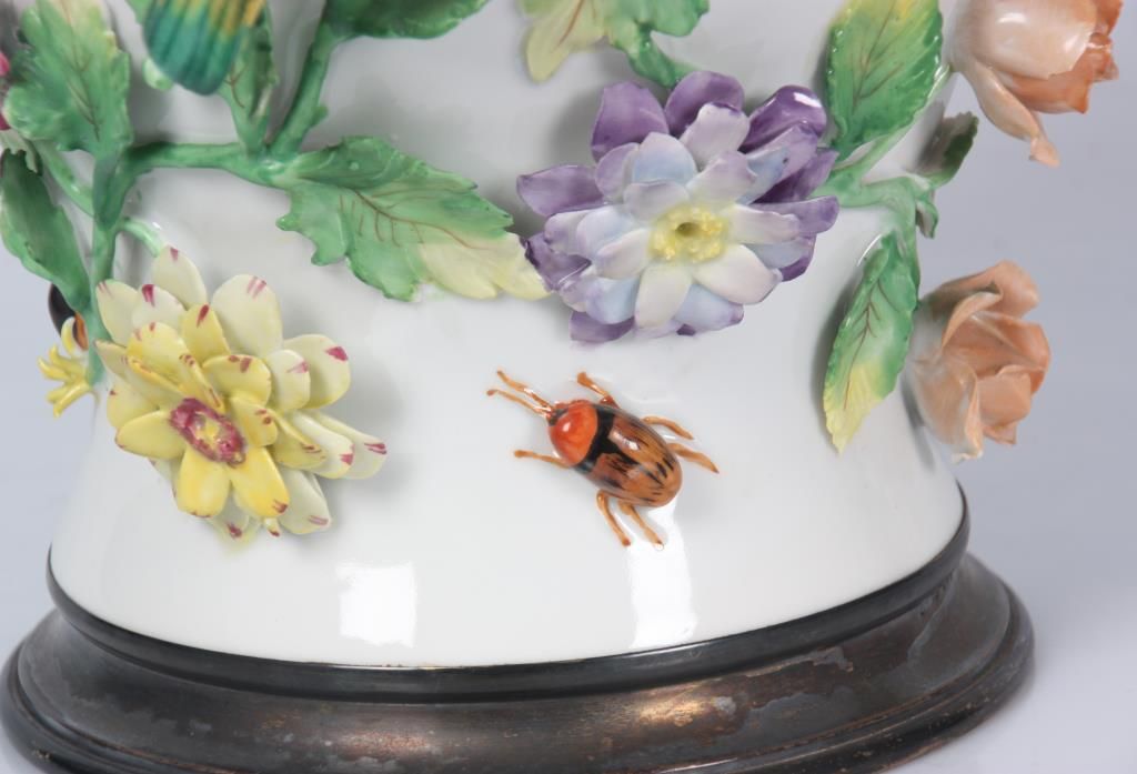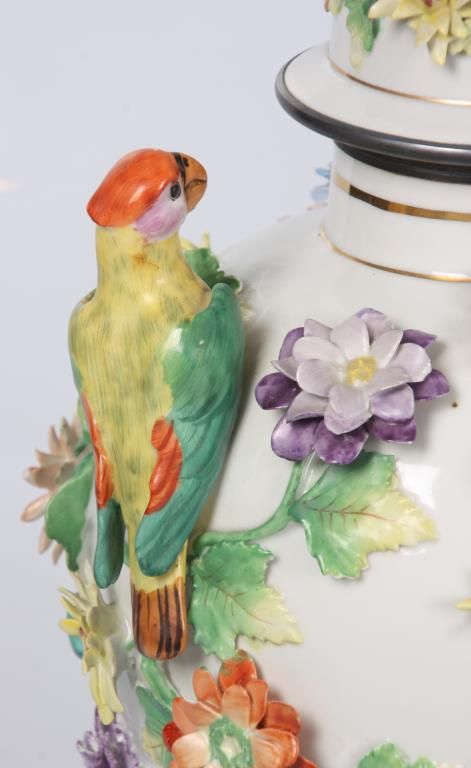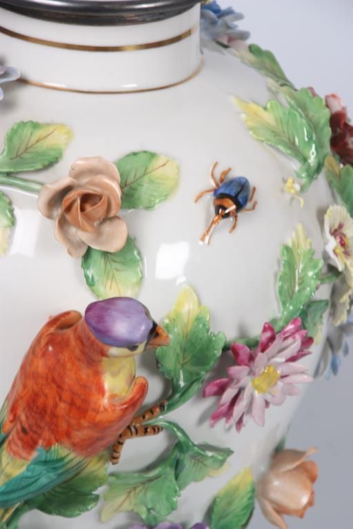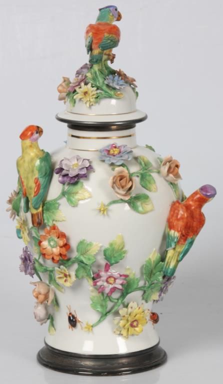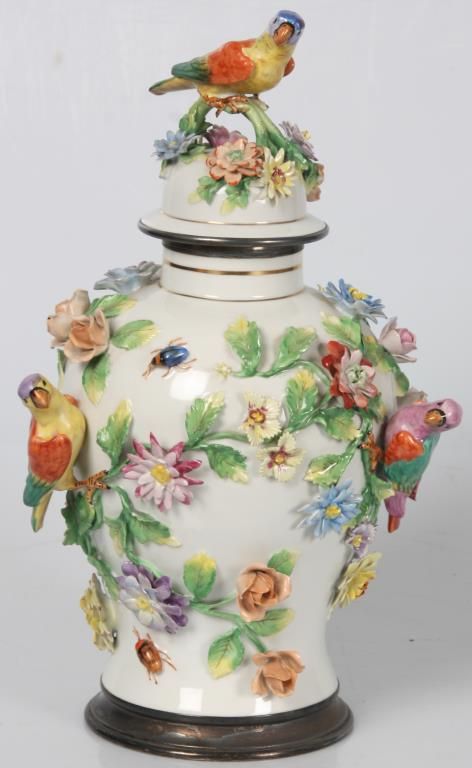 Dresden Floral, Bird & Insect Covered Jar. White porcelain jar has a baluster form with silver plated collar and foot rim; the domical lid has a colorful bird finial perched on a green branch with surrounding floral designs; the vase is decorated all over with applied designs including 3 colorful jungle birds, 3 insects and large color floral clusters with leafy branches, has some typical chips to the leaves and flower petals, 2 birds with broken wings. Signed on the base with Dresden under S.P. (Saxon Porcelain) mark. 16 in. high.