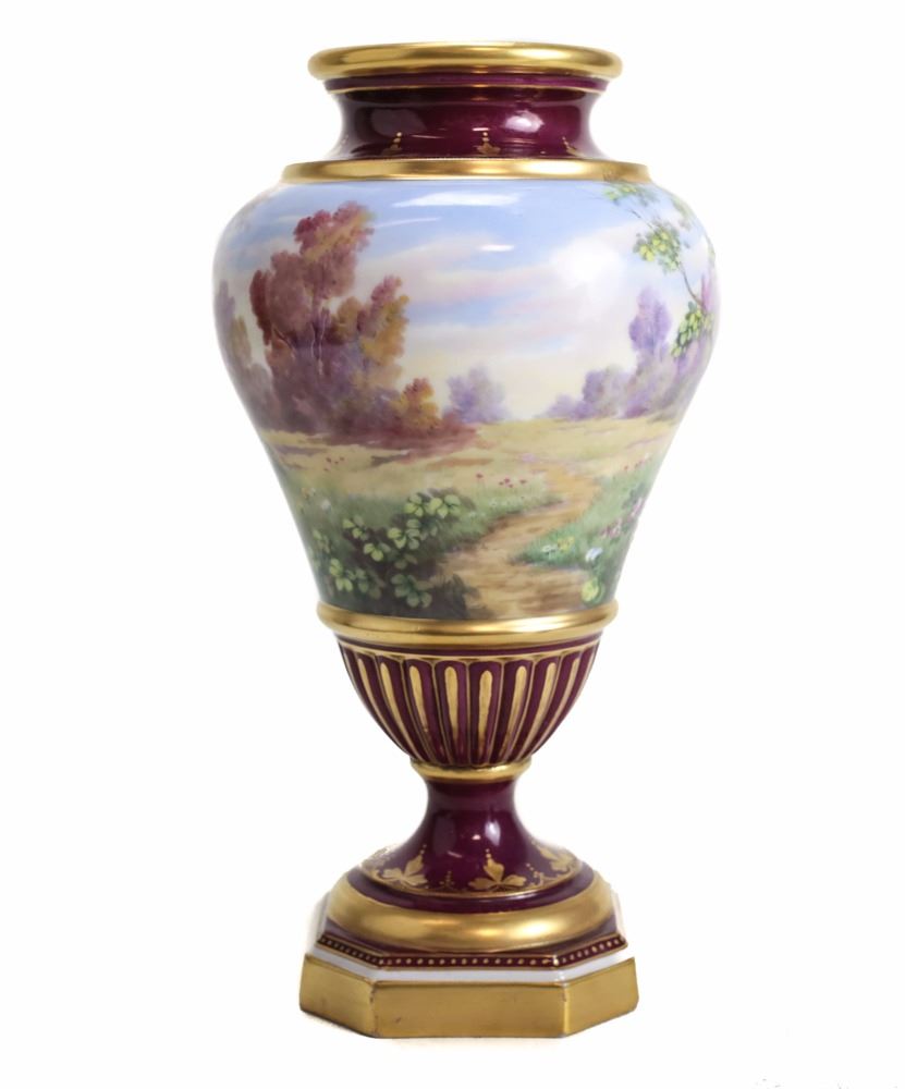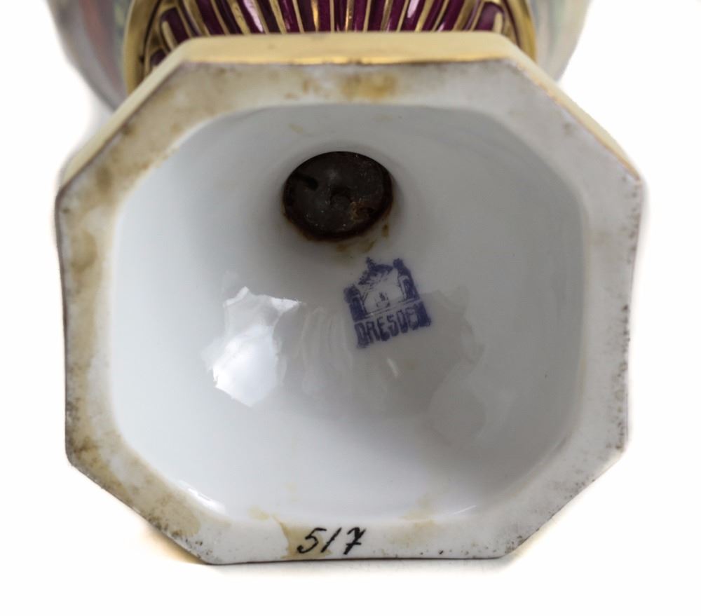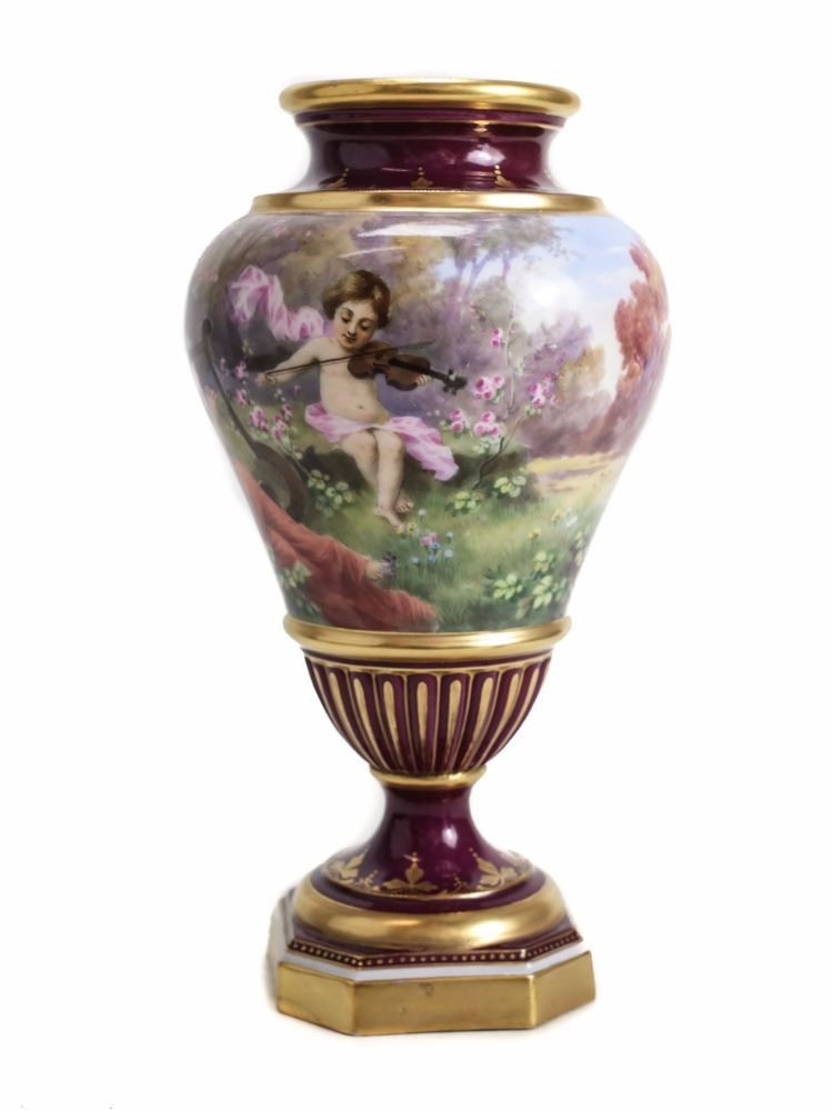 A Dresden porcelain vase in the Royal Vienna style, with painted beauty playing harp and cherub with violin. Gilt bead and floral accents on footed base.