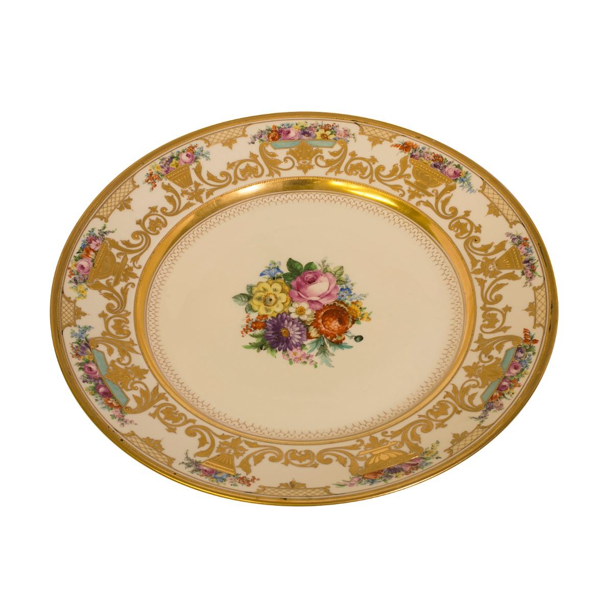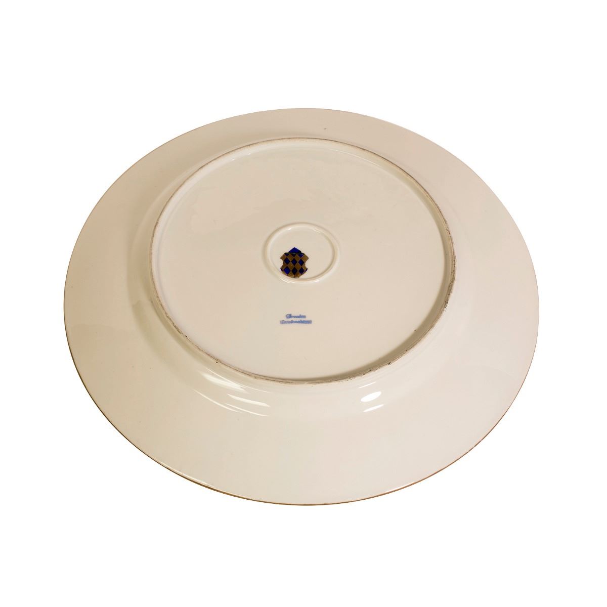 "Dresden" Serving Plate (Charger). Origin: Germany. Material: Porcelain, Period: 2nd Quarter - 20th Century, 14" Diameter x 1-3/4" High. Large Circular charger centering a "Deutche Blumen" (German Floral) bouquet, enclosed by a wide gilt and polychrome border of flowering urns; reverse with underglaze mark: Dresden, Hand Painted. Disclaimer: Actual Dresden or Meissen porcelain was one of the most forged porcelain in the world. Please do your research before buying. We make no warranty as to the authenticity.