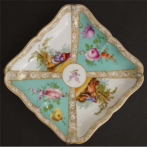 Porcelain square plate/bowl decorated with panels of hand-painted courting couples alternated with flowers on a pale aquamarine background with gold borders. Bowl is marked on the underside with a trademark in use between 1876 and 1901. The "T" stands for Carl Thieme, founder of the Potschappel (Germany - Saxony) traditional art porcelain factory that later became the SP Dresden (Saxon Porcelain Manufactory Dresden). In very good condition as shown. Comes wired ready to hang on the wall. Please ask questions, request additional photos and shipping costs before bidding.