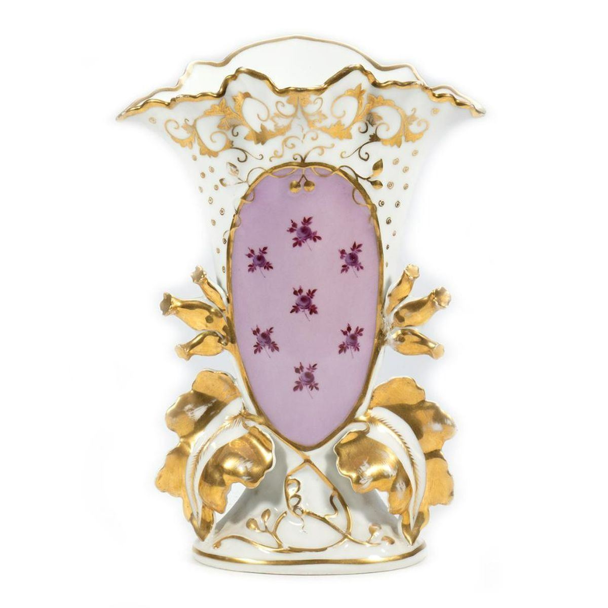 The porcelain vase with gilt floral scrolls centering a lilac cartouche flanked by gilt flowerheads. 13in. h. Condition: Repair to flower head on right side, wear to gilding.