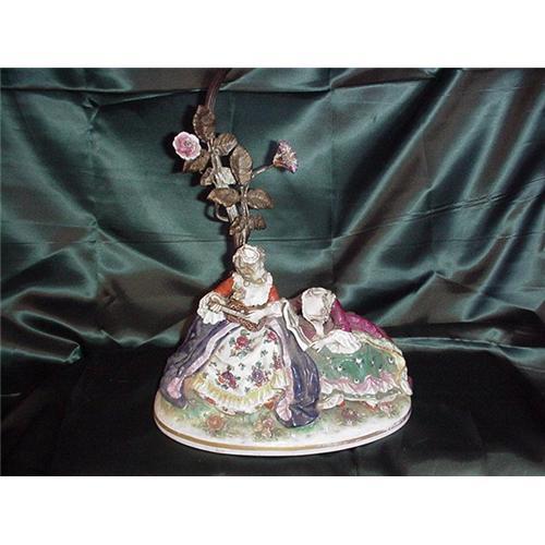 Dresden lamp two seated figures one with head missing , brass pipe in back with brass leaves and porcelain flowers supports lamp sold in as is condition. 10" long x 7 1/4" tall figure. 14" tall with lamp.