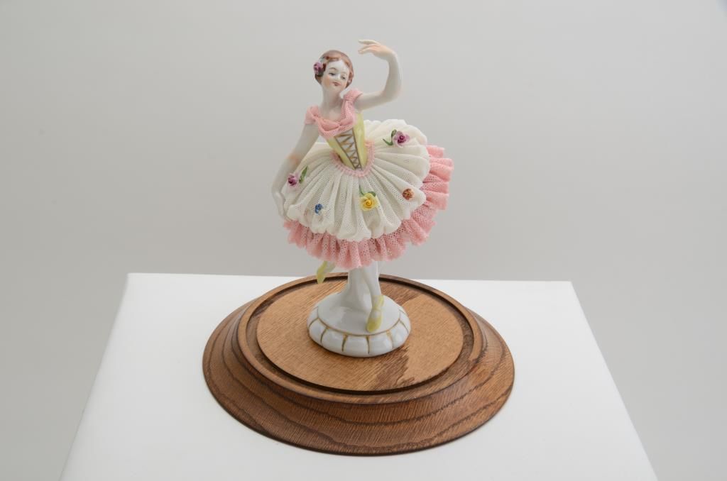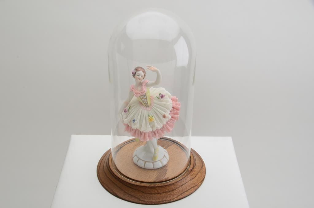 Dresden porcelain ballerina approx. 7” tall, finely detailed and in fine condition at time of description in glass dome with wood base. Est.: $150-$300.