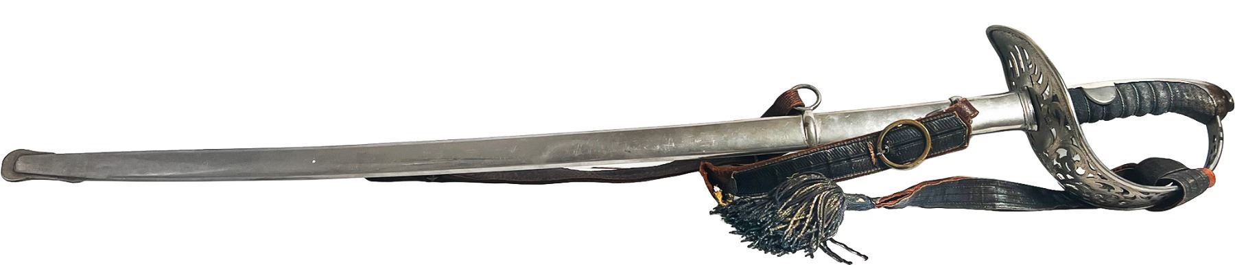 Dress sword and scabbard from Brazil for Heinrich Halfeld, Captain of Engineering in Minas Gerais, dated 1856. 1081 grams total. 39" long. Heinrich Halfeld (1797-1873), whose name appears on the blade of this ceremonial sword along with the date 1856, was a German engineer who was responsible for planning development in the Brazilian state of Minas Gerais. He was named Engineer of the Province of Minas Gerais in 1836, while he lived in its capital, Vila Rica (as it was named then). He oversaw the building of the main road from Vila Rica to the Province of Rio de Janeiro and in the process founded the city of Juiz de Fora. In 1842 he became Captain of Engineering and took part in the victory of Imperial troops in the Battle of Santa Luzia, for which he was awarded the Order of the Rose. The sword itself still has its original leather straps and ornamentations affixed to loops and hilt, completely intact, the sheath having preserved the blade in pristine condition.