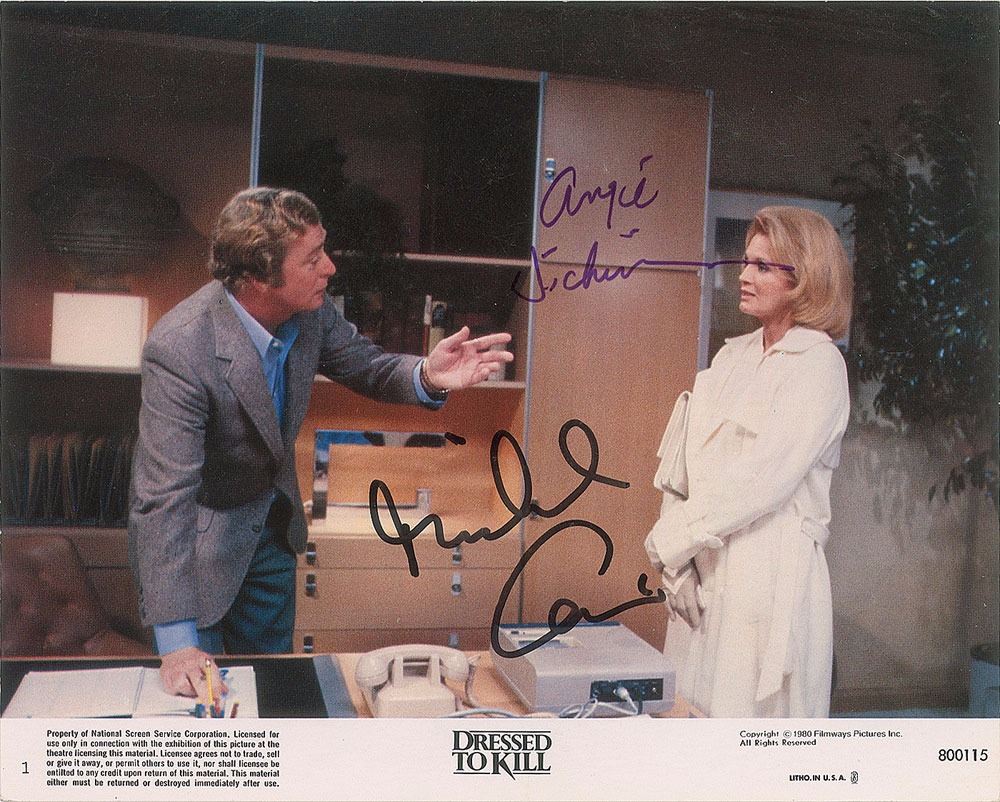 Color Filmways Pictures mini lobby card for the 1980 film Dressed to Kill, 10 x 8, signed in black felt tip by Michael Caine, and in purple felt tip by Angie Dickinson. In fine condition. From the Harvey and Rhoda Kuflik Collection.