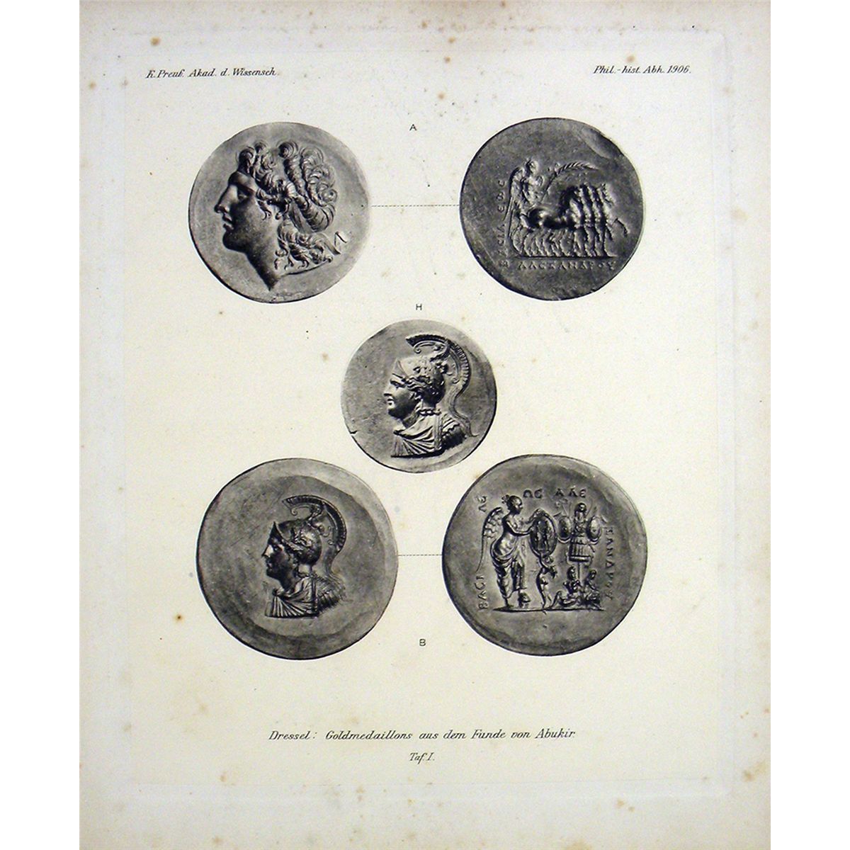 Dressel, Heinrich. FÜNF GOLDMEDAILLONS AUS DEM FUNDE VON ABUKIR. Berlin, 1906. 4to, original printed cloth-backed tan boards. 86 pages; text illustrations; 4 superb plates of medallions. Boards dusty and bit bowed; some marginal spotting; very good. Rare, with very fine plates. Ex Edward Stanley Gotch Robinson, with front cover initialed. A copy of R. Weil's "Goldmedaillons von Abukir," offprinted from the Jahrbuch des Kaiserlich Deutschen Archaologischen Instituts (1907), is laid in. Clain-Stefanelli 3226.