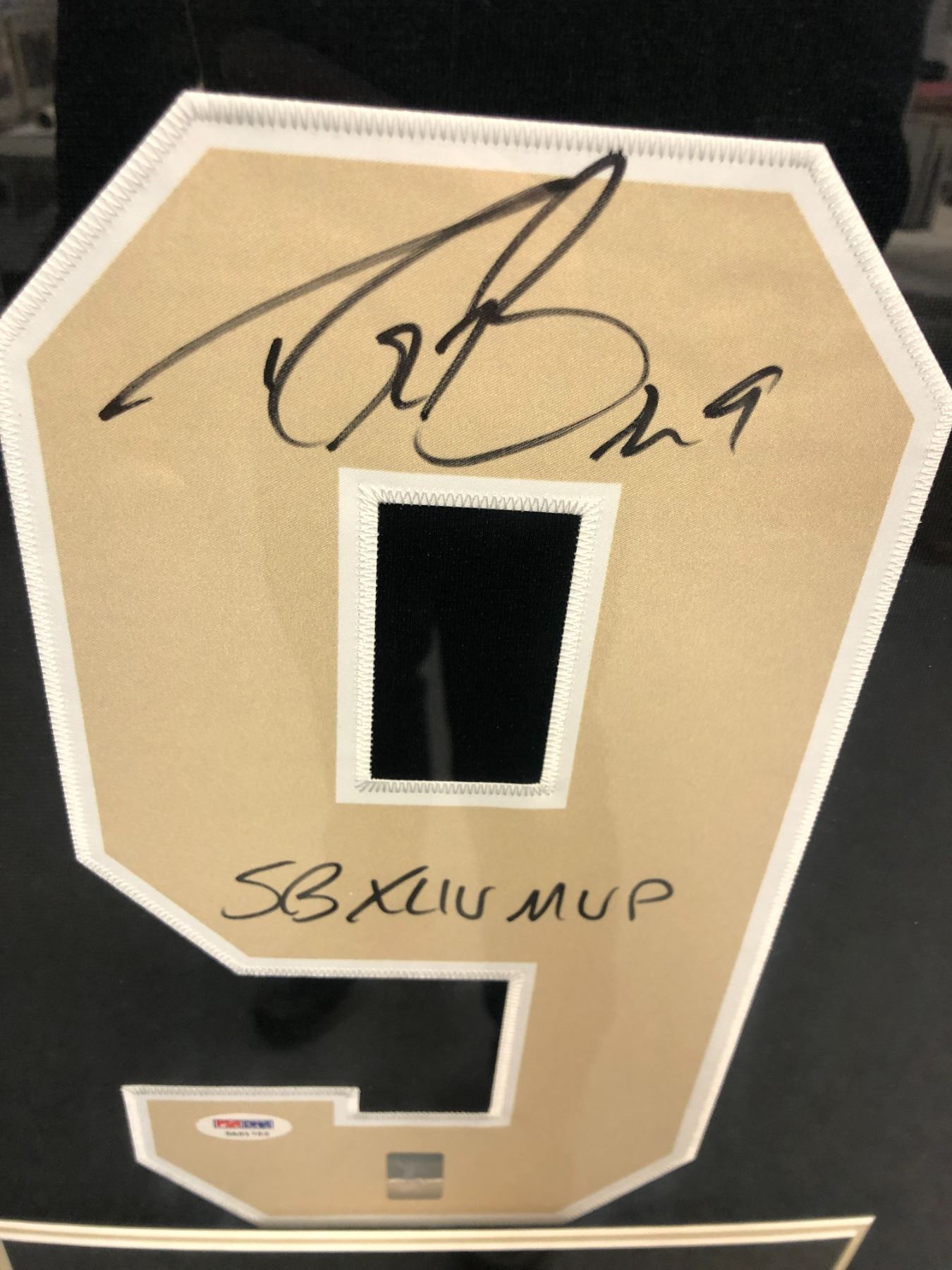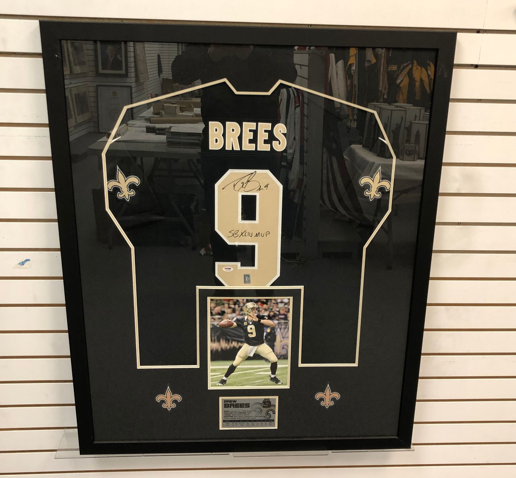 Drew Brees #9 Quarterback from the New Orleans Saints - Framed Autographed Jersey with COA sticker. Frame size approximately 34 1/2 x 42 1/2".