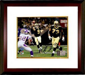 Drew Brees has been selected to the Pro Bowl four times in his career – with the Chargers in 2004 and the New Orleans Saints in 2006, 2008, and 2009. He was named the NFL's Comeback Player of the Year in 2004, the Offensive Player of the Year in 2008, and the MVP of Super Bowl XLIV. Drew Brees has hand signed this New Orleans Saints 16X20 Photo from the NFC Championship game against the Vikings. Custom White Mat and Premium Mahogany Framed as shown. Brees Hologram and Certificate of Authenticity from Athlon Sports.