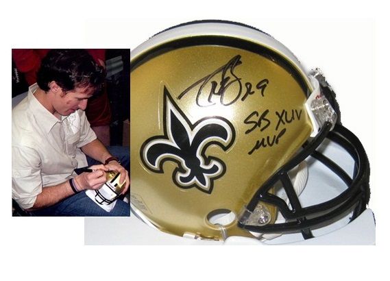 Drew Brees Signed & SB MVP Inscribed Authentic New Orleans Saints Mini NFL Helmet. Comes with a Certificate of Authenticity with matching #'d holograms and online verification from VA Auctions. This is a stock photograph which means that you will receive an item of the same or higher quality and excellence.