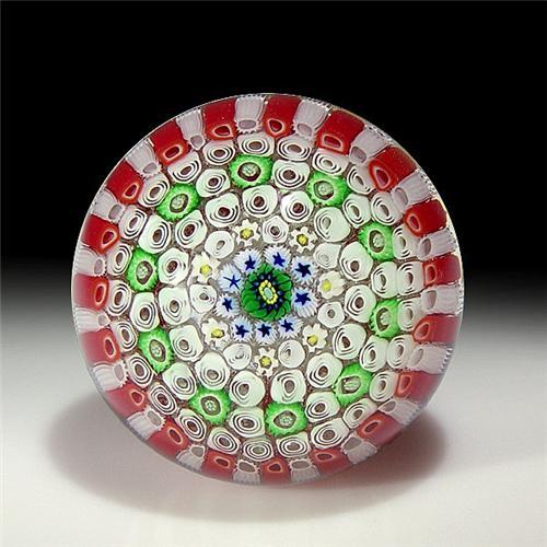 Drew Ebelhare 1996 miniature white carpet ground paperweight. A central complex signature cane is encircled by a ring of blue and white star canes, which are surrounded by concentric rings of white bull's-eye canes, and spaced green and yellow canes, within a red and white stave basket. Signed/dated. Diameter 2 1/16". <p>Each winning bidder will receive one copy of "All About Paperweigths" and a paperweight stand for each paperweight won. (One book per winner, one stand per paperweight).