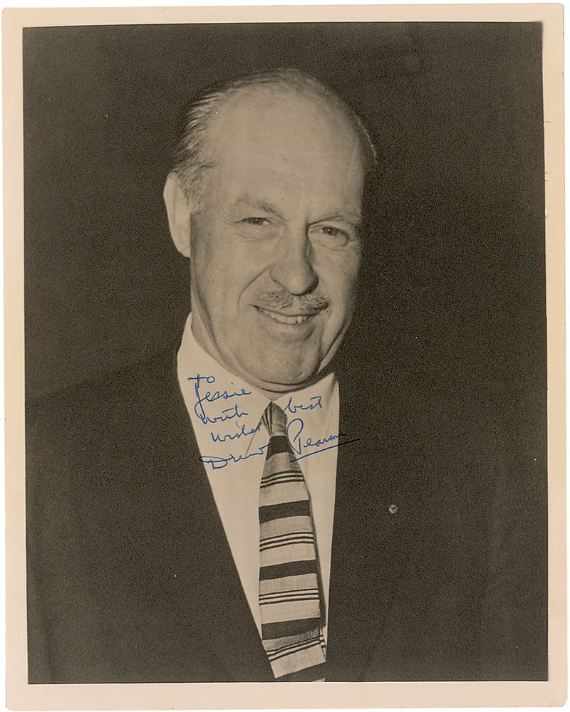 Controversial American journalist (1897-1969), remembered for his muckraking journalism and syndicated ‘Washington Merry-Go-Round’ newspaper column. Tasteful 8 x 10 paperstock photo, signed and inscribed in blue ballpoint “to Jessie, with best wishes, Drew Pearson.” In fine condition, with scattered light creasing and some show-through from paper loss on reverse.