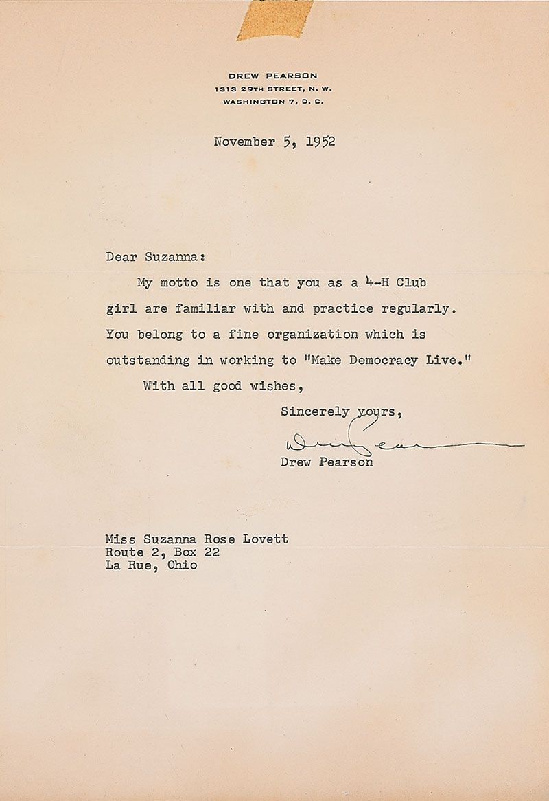Controversial American journalist (1897-1969), remembered for his muckraking journalism and syndicated ‘Washington Merry-Go-Round’ newspaper column. TLS, one page, 7.25 x 10.5, personal letterhead, November 5, 1952. Letter to a young woman asking for his favorite quote. In full: “My motto is one that you as a 4-H Club girl are familiar with and practice regularly. You belong to a fine organization which is outstanding in working to ‘Make Democracy Live.’” In fine condition, with mild overall toning, a bit heavier to edges and an old piece of tape to top edge. Accompanied by the original mailing envelope and an unsigned 8 x 10 photo.