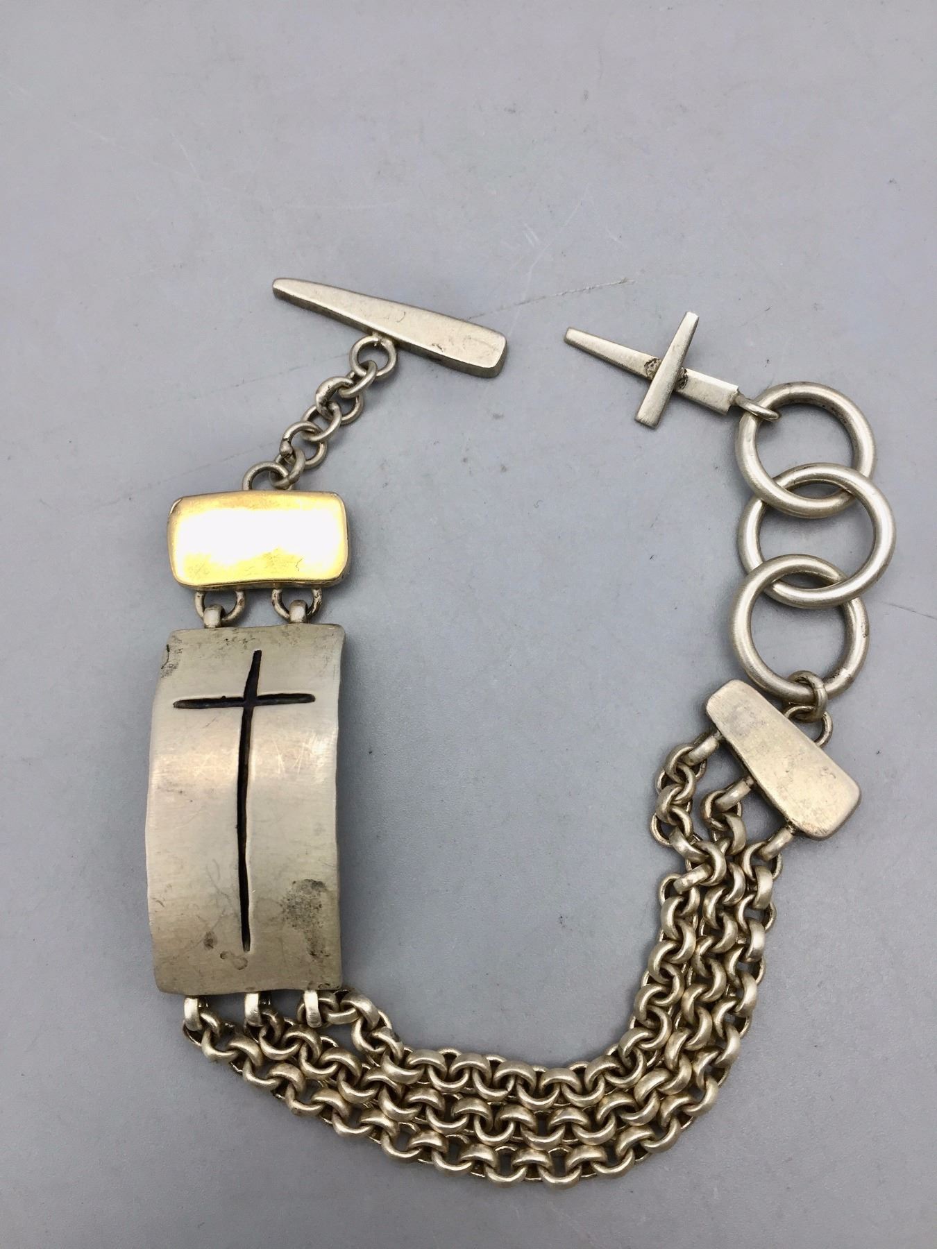 Description: Sterling silver and 14k gold bracelet. Maker: Drew Ruiz. Approx. Age: Fairly contemporary. Size: 7 5/8” long overall, (multiple loops for sizing) 5/8” w. Condition: Good for its age, normal wear expected. Please look closely at the pictures - they are an important part of our description. Shipping: There will be a $5 handling / packaging fee for shipping this lot. The actual cost of postage will be added on top of that.