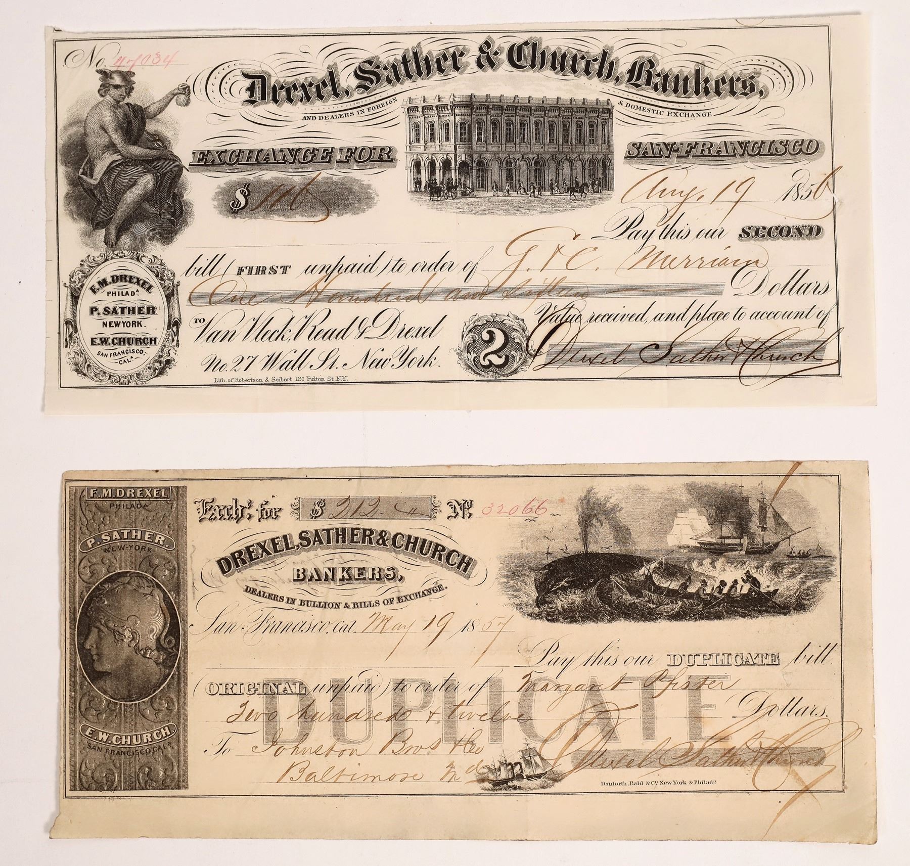 Two exchange notes from Drexel, Sather & Church, Bankers and Dealers in Bullion and Bills of Exchange. The partners in this bank covered the county: F.M. Drexel in Philadelphia, P. Sather in New York and E.W. Church in San Francisco. They were one of the top exchanges of the California Gold Rush and major shippers of gold to New York. One of the treasure boxes in the S.S. Central America sale belonged to this company. These exchange notes are from 1856 and 1857. They are two different versions. The one with the whaling vignette is extremely rare and desirable. Good condition.