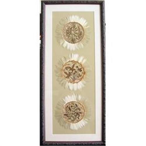 This a framed piece with three dried arrangements of ferns and plant parts. The framing is recent and the arrangement is typical of late 1890's. The second and third photo's are of the folder that these were found in. The inscription in part says - Made of lace mark, and the wings of the seed of the French cotton. The borders are from the spahin (?) of the mountain cabbage palm. The ferns are gathered from different parts of Jamaica. The inscription includes the latin specie names. A copy of the inscription is included. The dimension given is the diameter of each arrangement. The overall framed dimension is 12 by 27 inches. See also my item art005 for a grouping of two similar fern arrangements.