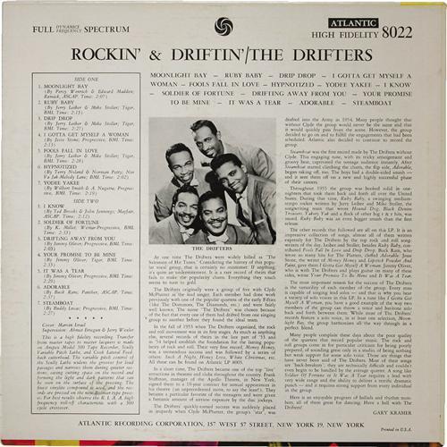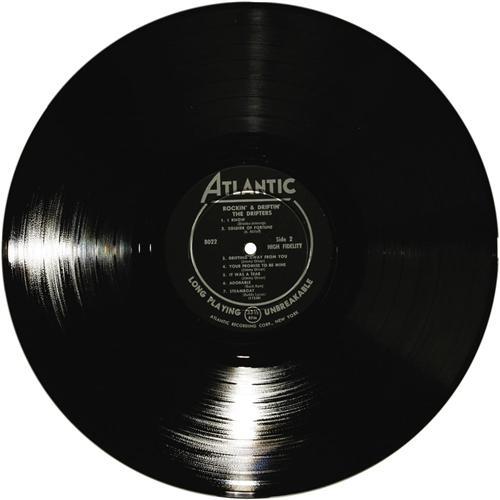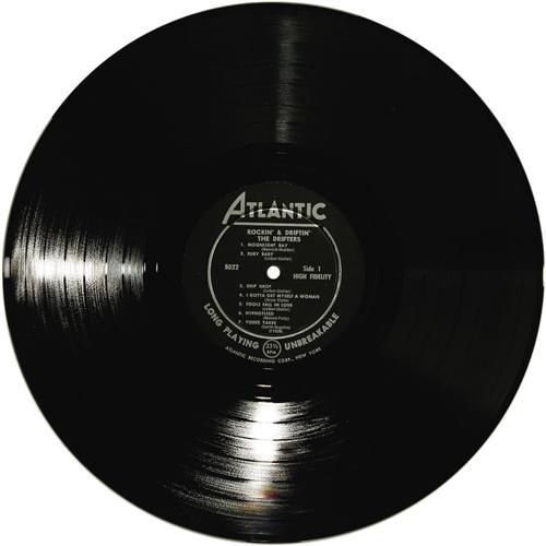 <B>Drifters "Rockin' & Driftin" LP (Atlantic 8022, 1958).</B></I> The Rock and Roll Hall of Fame group had already enjoyed great success on the R&B charts (12 Top Ten hits prior to 1958), but were still looking for their first big crossover hit when this seminal album came out. One future Rock star was listening -- Dion had big hits years later with "Ruby Baby" and "Drip Drop", both of which are featured on this tough-to-find album. This is the rarer black label version. Condition: NM 8/ EX 7. <I>From the GRT Collection</B></I>.<BR><BR><b>Shipping:</b> Recordings (<a target="_blank" href="http://www.heritageauctions.com/common/shipping.php">view shipping information</a>)